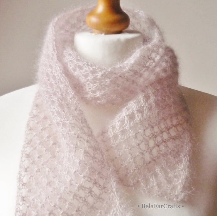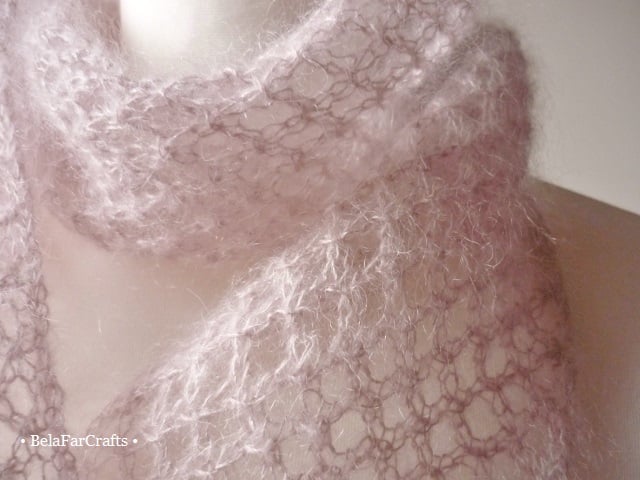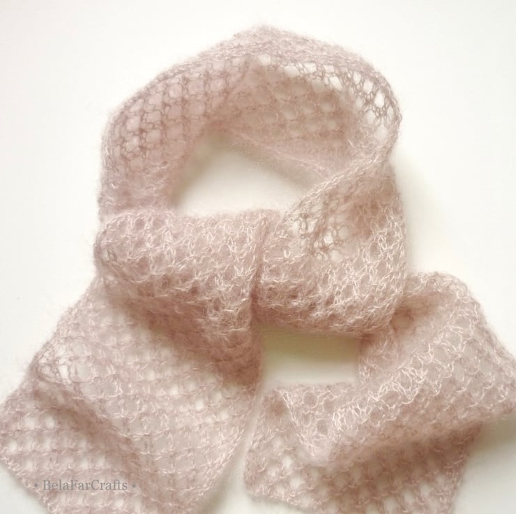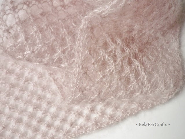 I used a fine and luxurious mohair / silk yarn and slightly larger needles for the airy feel and to suit this type of yarn. The colour is a subtle dusky pink - effortlessly matched with brown, navy blue, charcoal grey, burgundy etc.