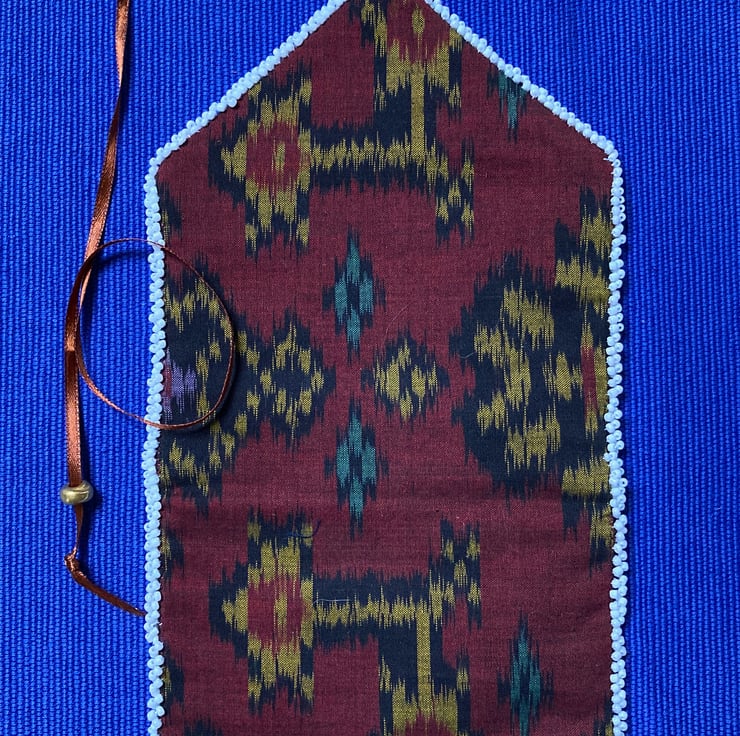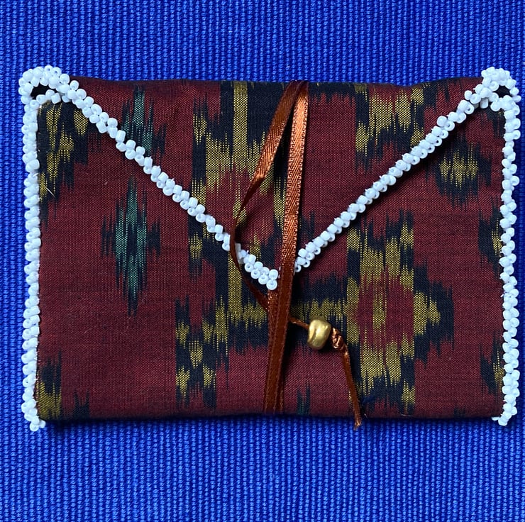 Based on the traditional Afghan folded purse this is made from beautiful Ikat fabric from Bali woven on a hand operated loom. Featuring a dark red background with gold, black and blue motifs, this fabric showcases the intricate beauty of traditional ikat weaving. The purse is beaded around the edges and has two internal pockets. When folded closed it is secured by wrapping the ribbon around the purse. Size when closed is 13cm x 10cm. Each pocket is approximately 8cm deep. Works well as a small purse or for storing precious items such as jewellery.