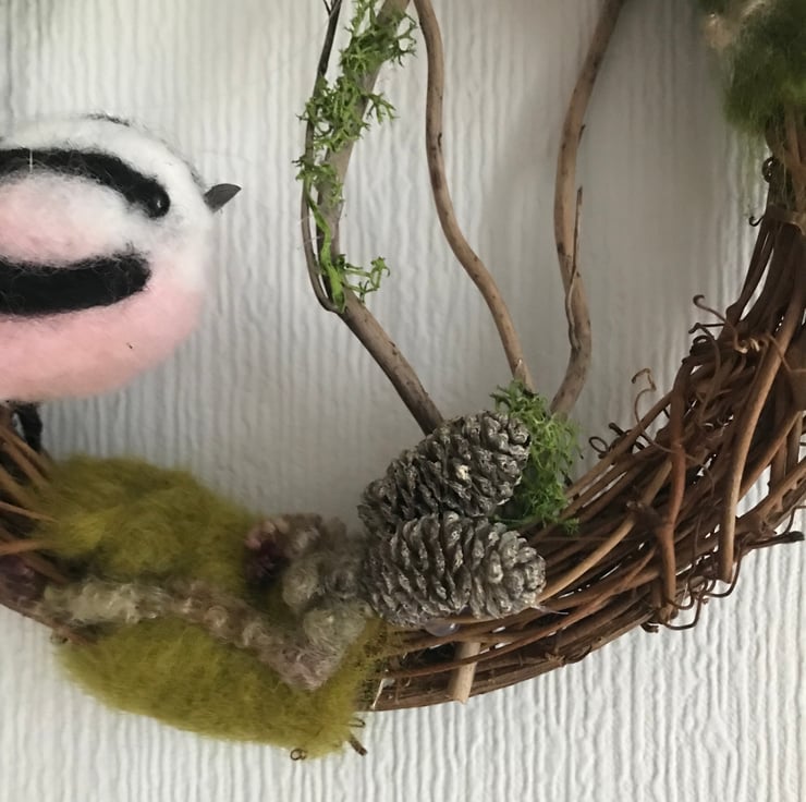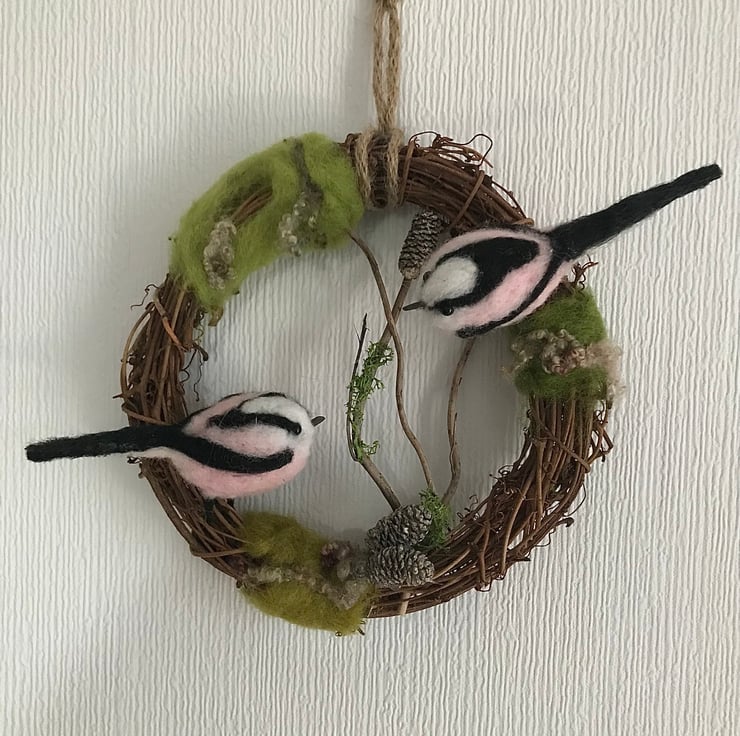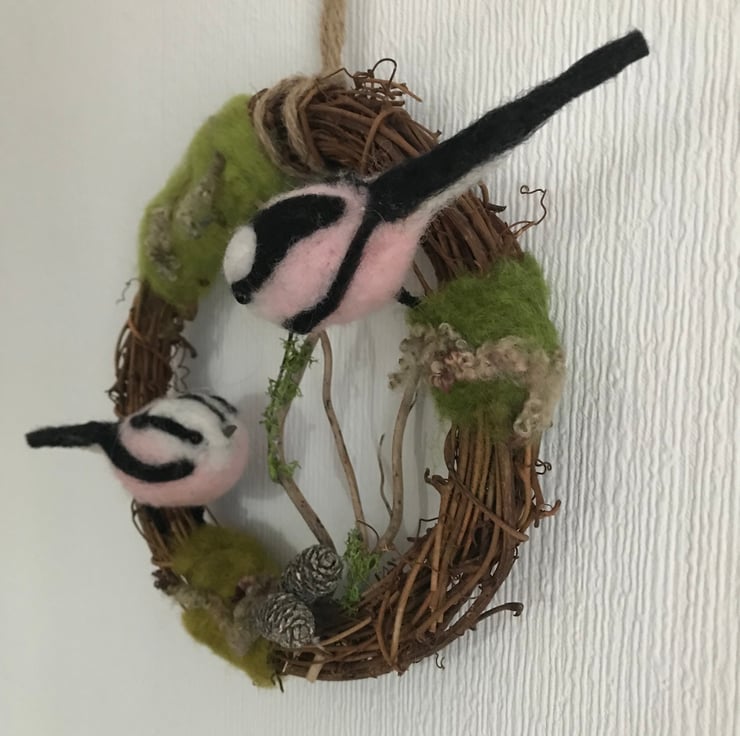 Long tailed tits , needle felted and attached to a rustic wreath.