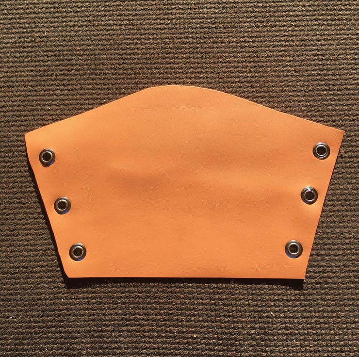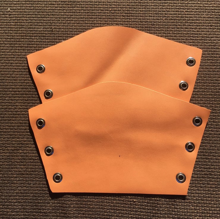 Measurements: 6"across the bottom, 9" across the top (at the widest part). 5.5" from top to bottom. Don't forget they will expand a bit after you put in the lacing. These bracers have nickel plated eyelets. All bracers sold with lacing - lacing colour will vary based on what is in stock to supply with the order. The leather was purchased in the pre-dyed peach colour that you see and has a weight of roughly 2oz.