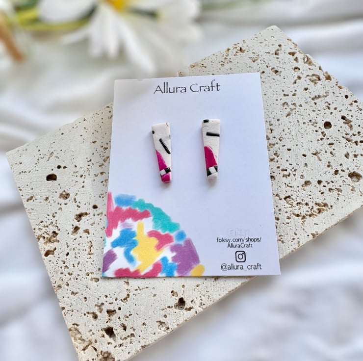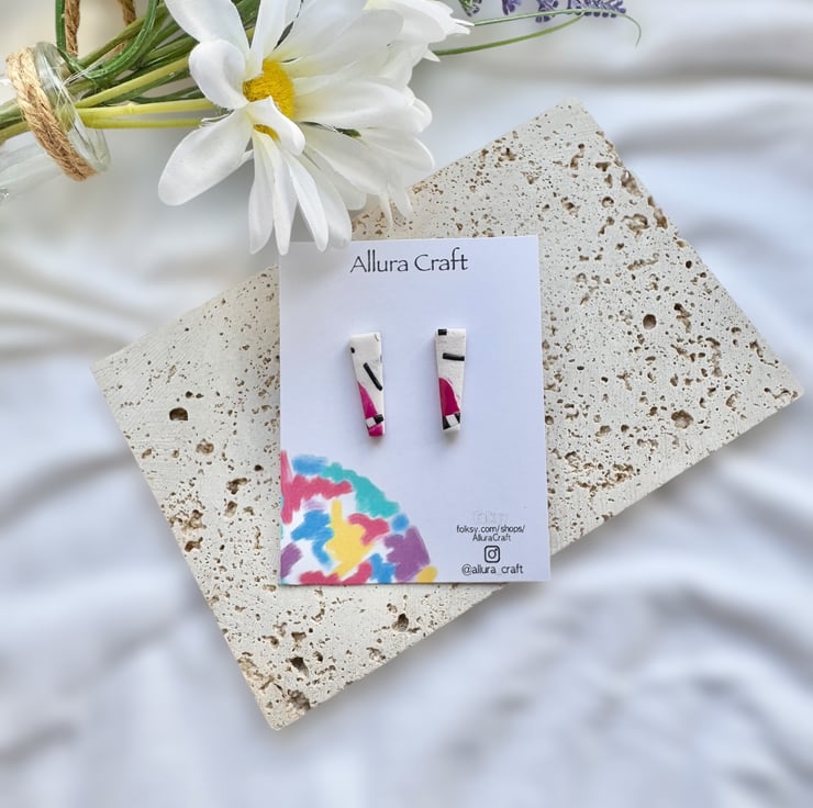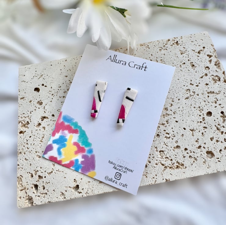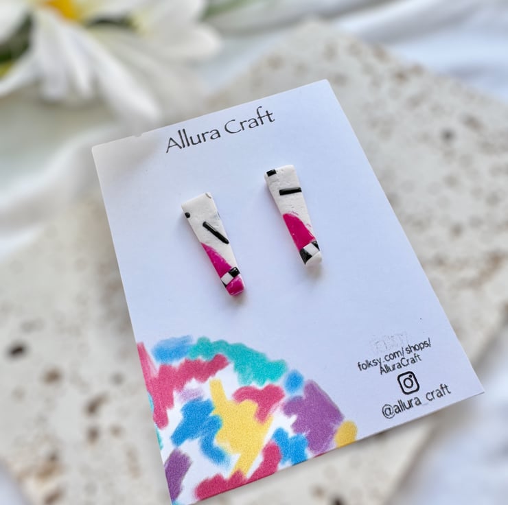 Dainty White texturised polymer clay base and pink and black accent design, in an upside down trapeze shape .