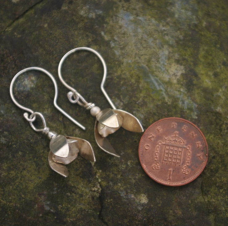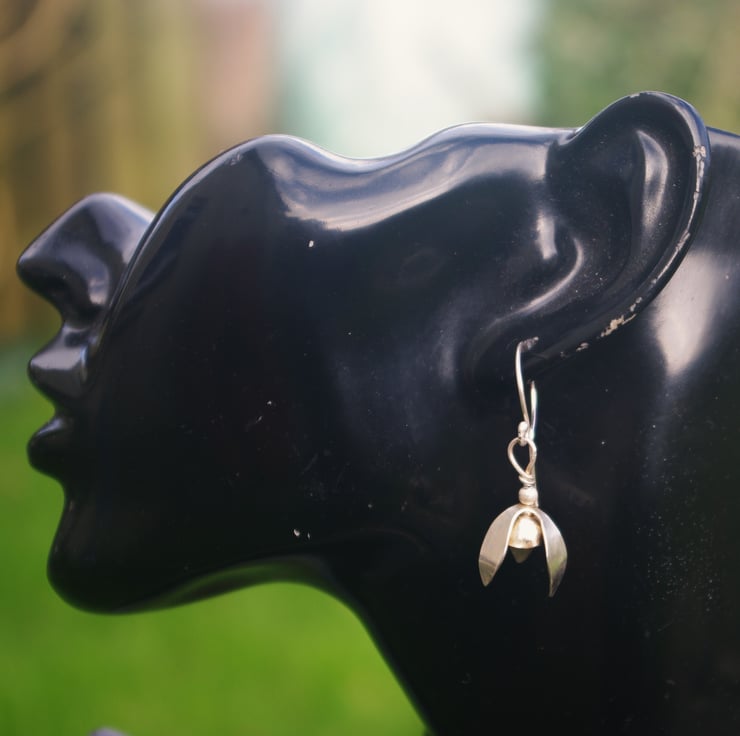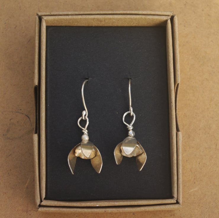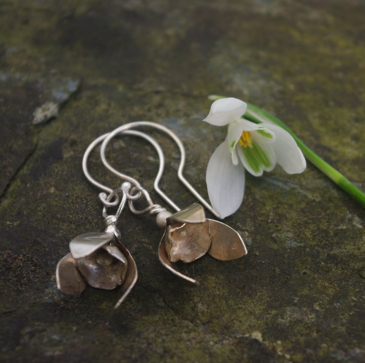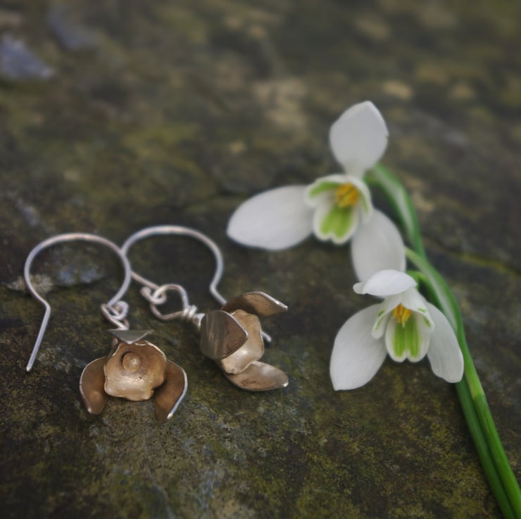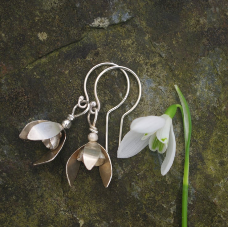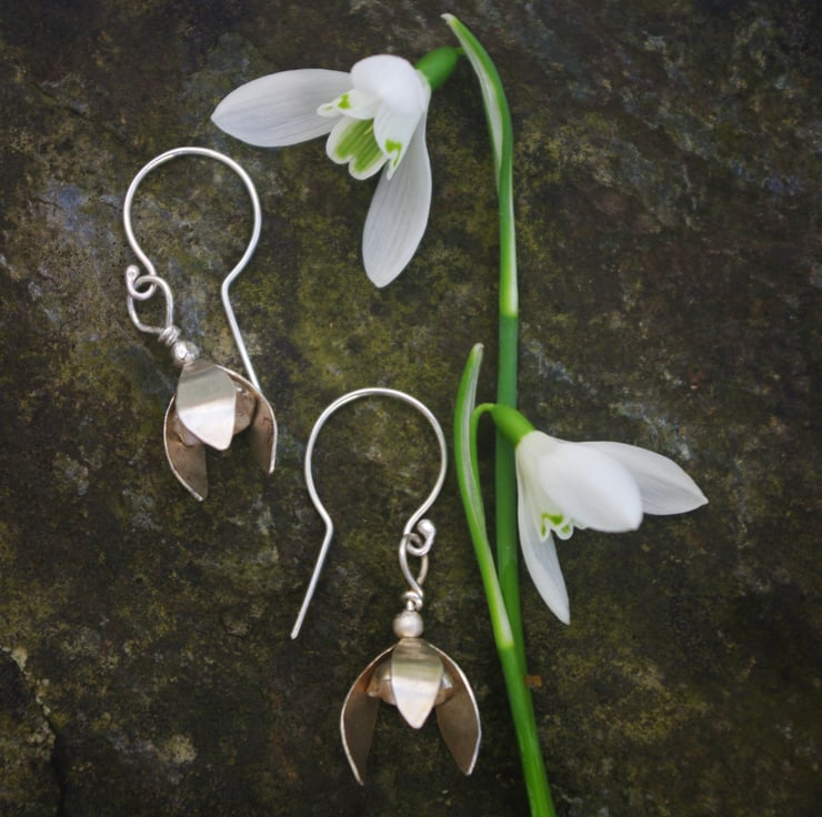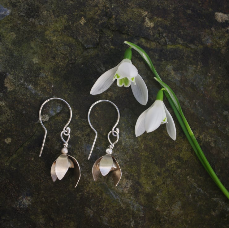 Earrings inspired by the beautiful snowdrop. The petals are cut from one piece of eco sourced sterling silver with the inner petals of the snowdrop dangling from the inside. The pieces are separate, held in place by a blob of silver in the centre of the flower, so the whole flower is free to move about. The ear hooks are handmade from eco sterling silver wire. Each petal is about 13mm long and about 6mm wide and each earring is slightly different as I have cut out the shapes by hand with a piercing saw.