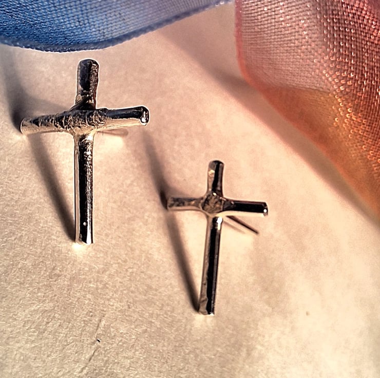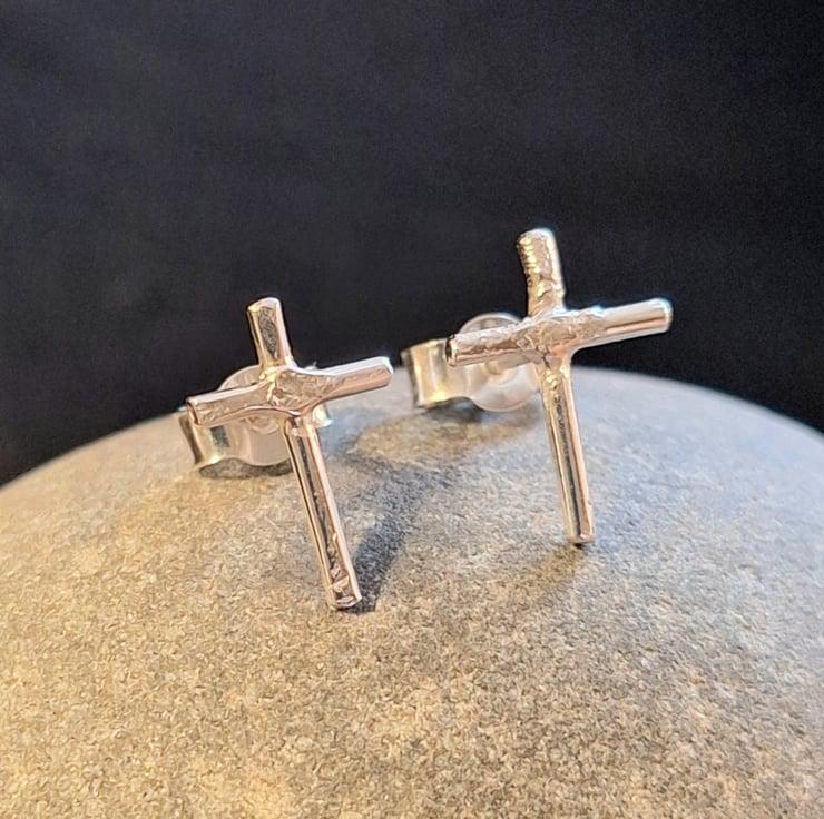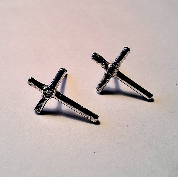 Delicate silver cross studs - handmade in Somerset. Approx 1.3cm long.