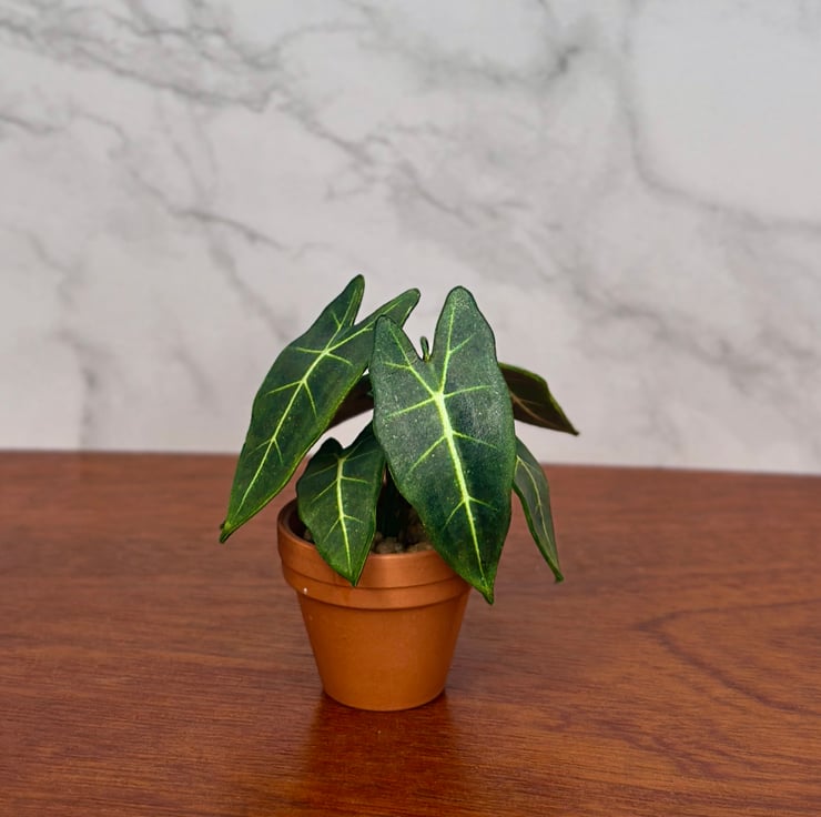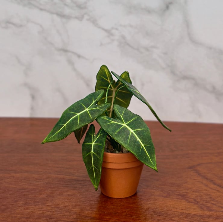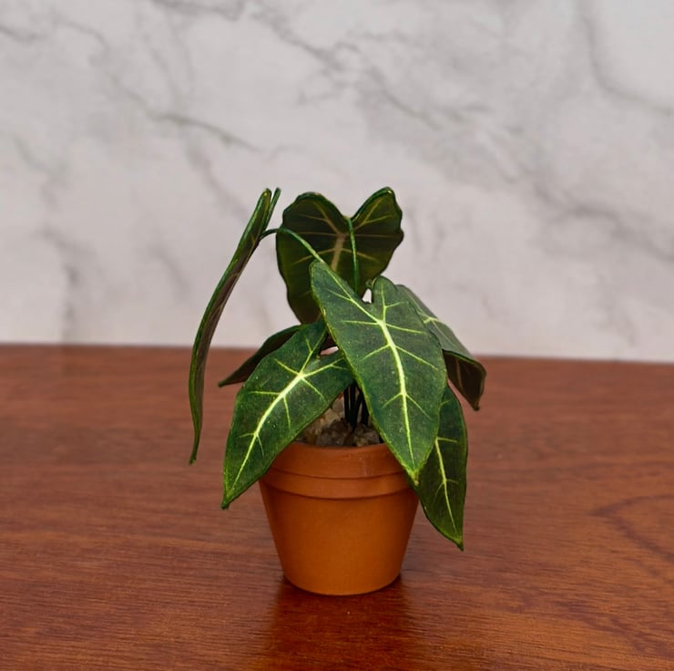 Each piece is meticulously made using high-quality materials, ensuring a realistic, lifelike appearance that enhances any miniature scene or dollhouse display. Whether you're creating a miniature garden, curating your miniature plant collection, or simply adding a pop of greenery to a dollhouse interior, this tiny Alocasia Frydek is the perfect choice.