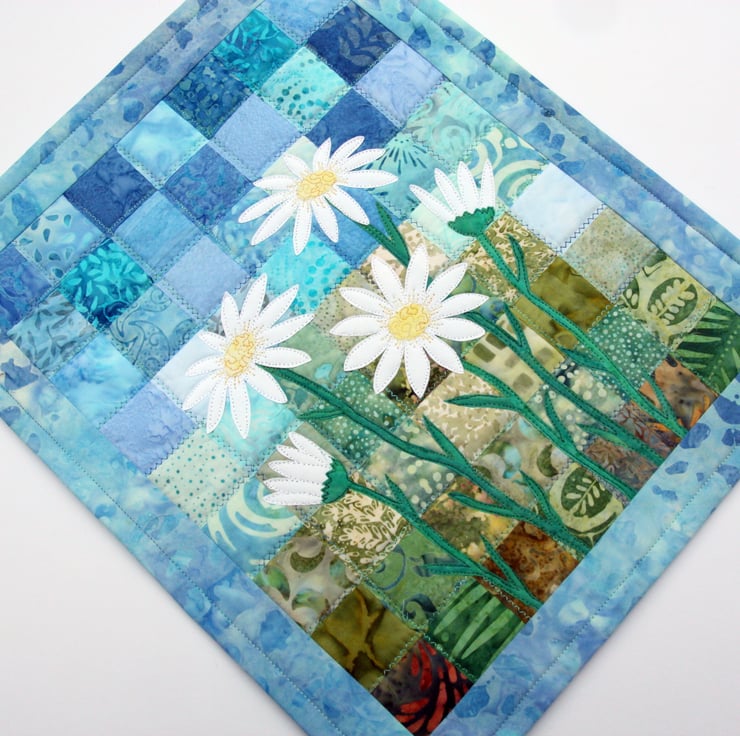 This design uses raw edge applique and fabric collage. I would recommend this to crafters familiar with free motion embroidery.