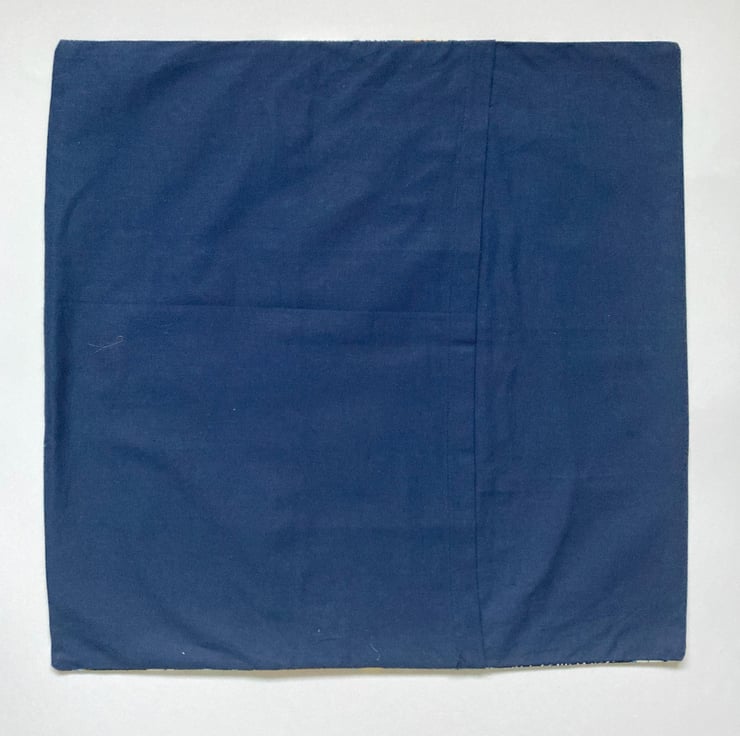 A patchwork cushion cover made from bright and crazy patterned pieces of West African wax printed cotton, with a plain blue heavy cotton envelope back.