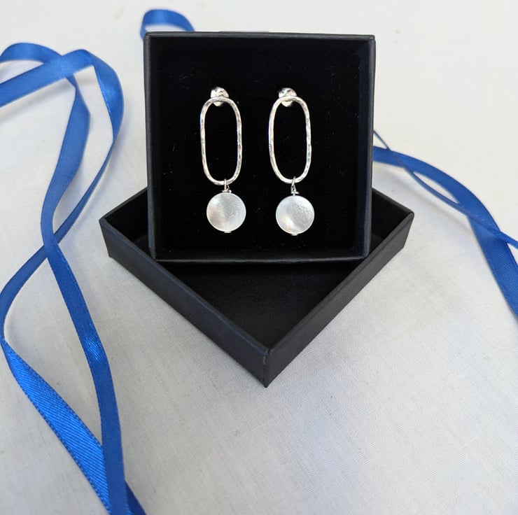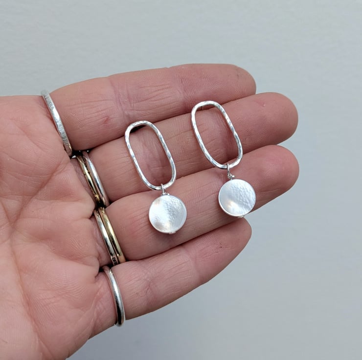 Solid sterling silver earrings, with a lovely mother of pearl drop. The hammered texture catches the light for a bit of sparkle, and they are very light for everyday wear. Handmade in Sheffield from recycled silver.