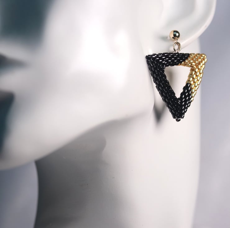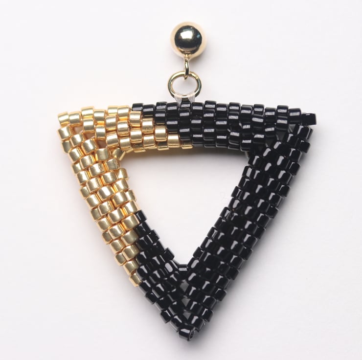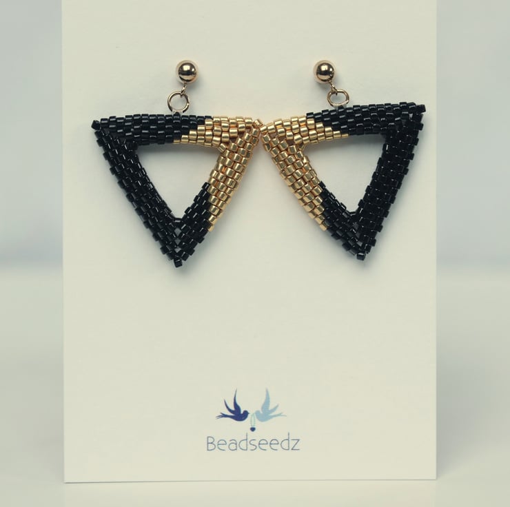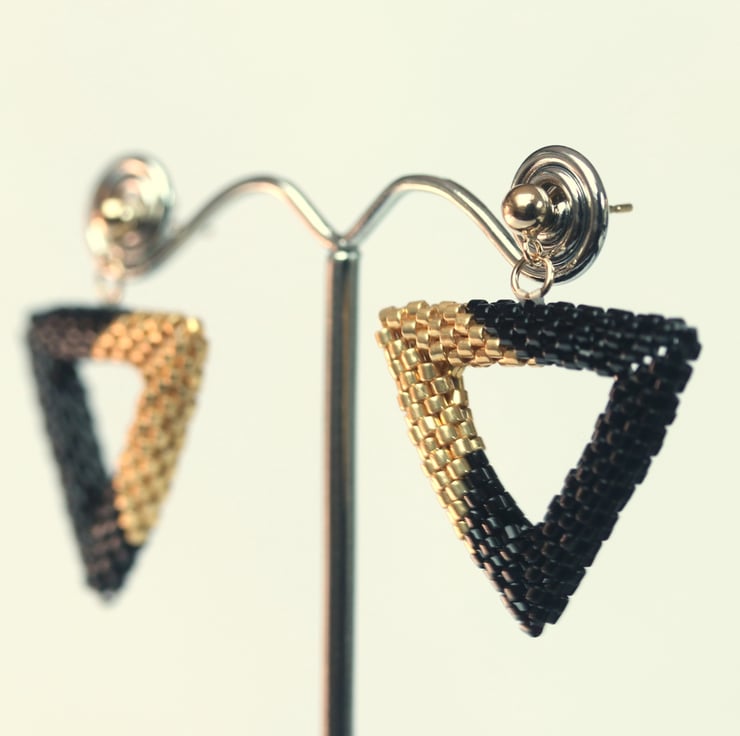 To make these earrings I have used size 11 gold coloured and shiny black Miyuki Delica beads. They are made by a process called beadweaving, by which the beads are sewn together by strong Fireline beading thread (not unlike fishing line).