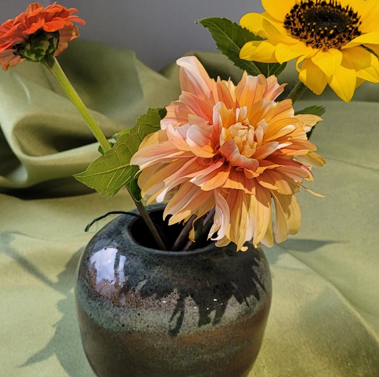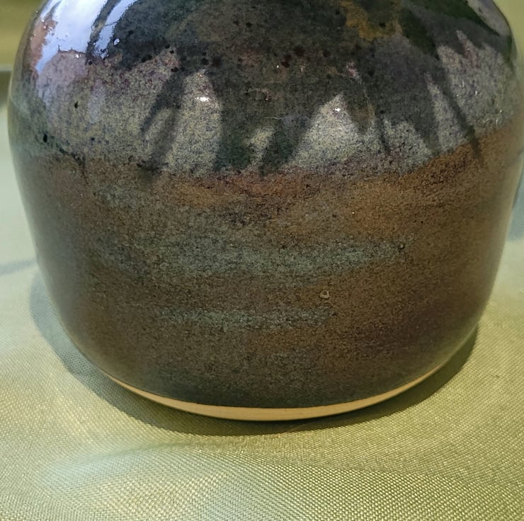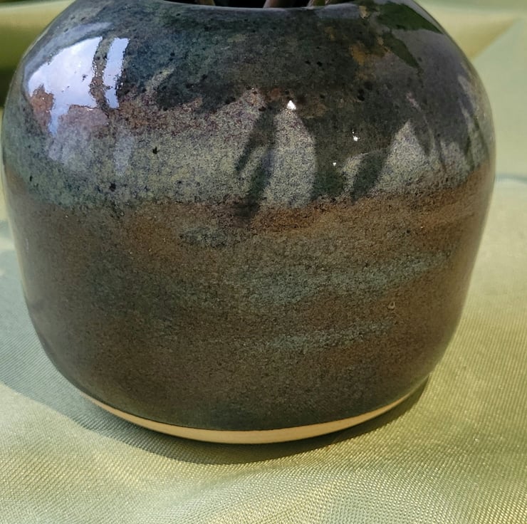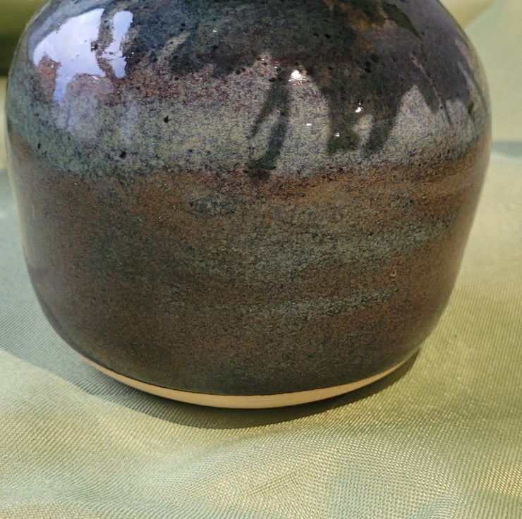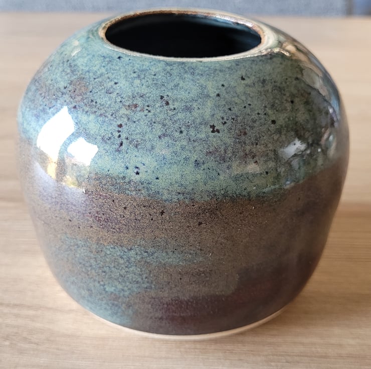 Medium wheel thrown Bud vase with a blue- brown speckled glaze covering both the inner and outer surfaces. Diameter of the piece at its widest point measures 12cm and the height measures 10cms.