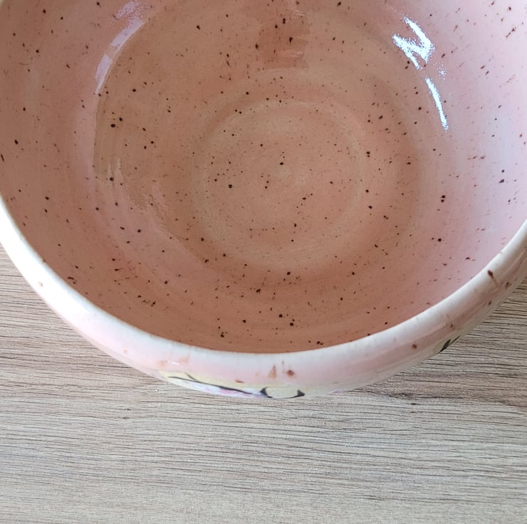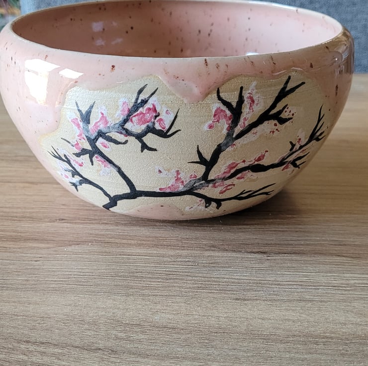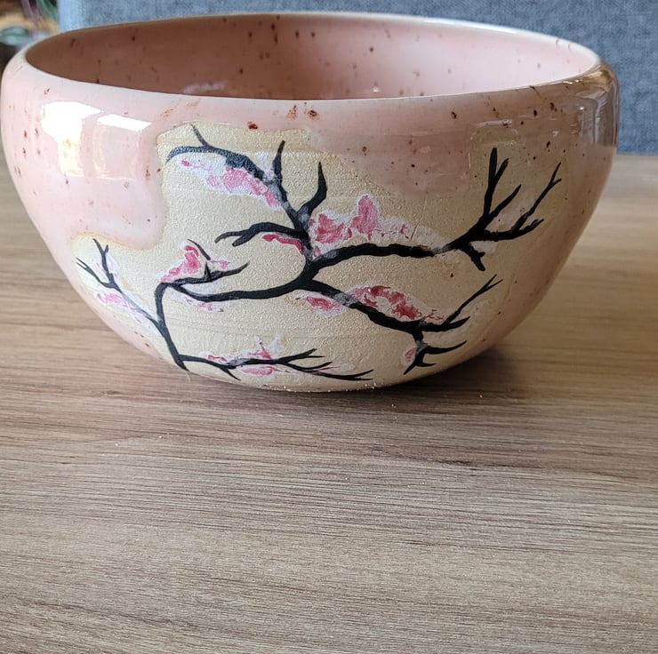 Large wheel thrown bowl with a speckled light pink glaze covering both the inner and outer surfaces. The bowl also has a hand painted cherry blossom design on the outer surface of the bowl. Diameter of the piece at its widest point measures 18cm and the height measures 9cms.