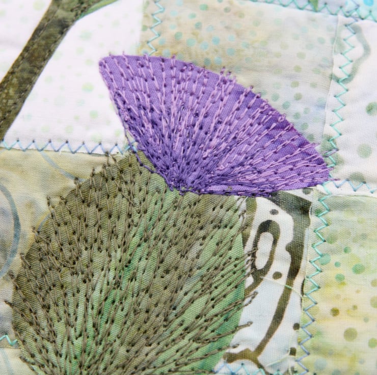 This design uses raw edge applique and fabric collage. I would recommend this to crafters familiar with free motion embroidery.