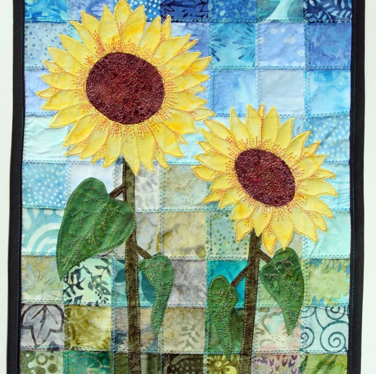 This design uses raw edge applique and fabric collage. I would recommend this to crafters familiar with free motion embroidery.
