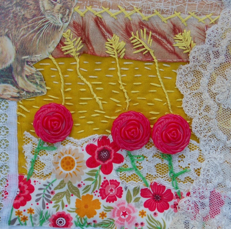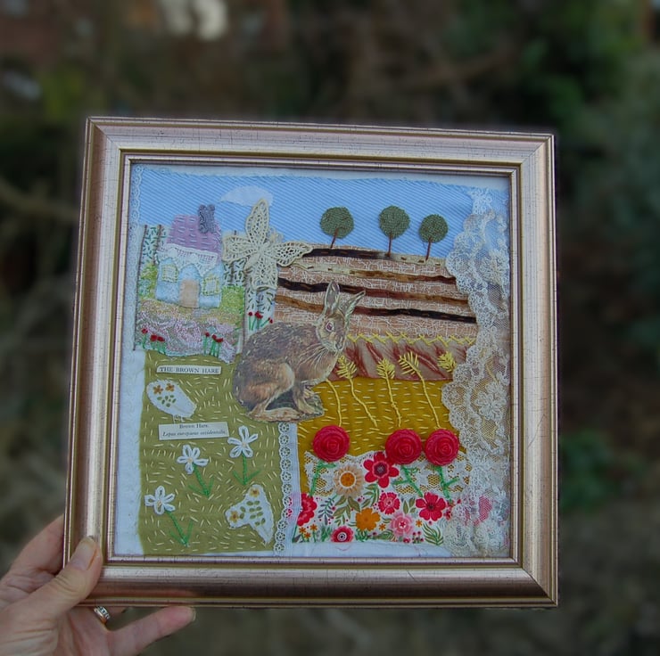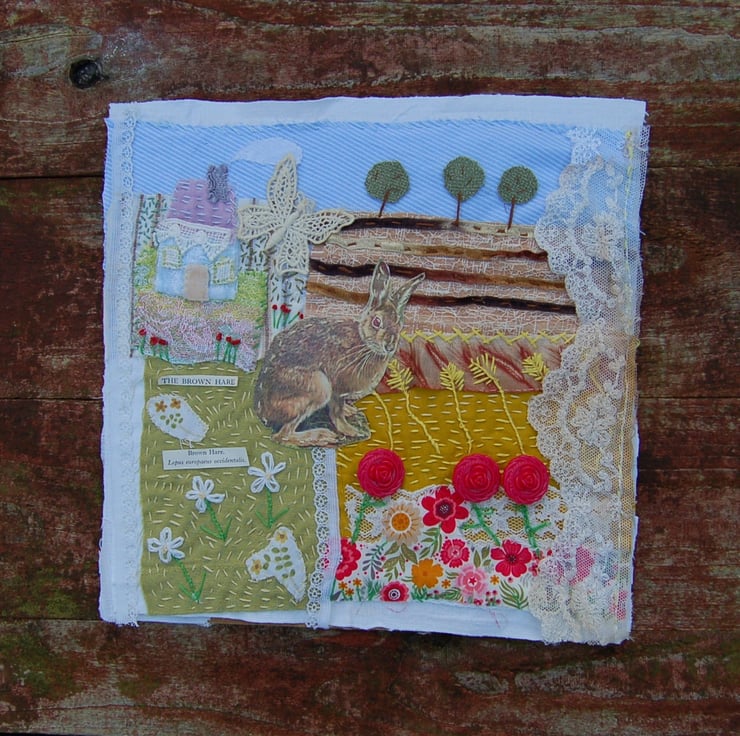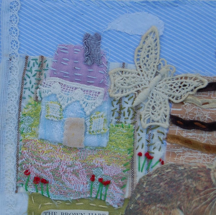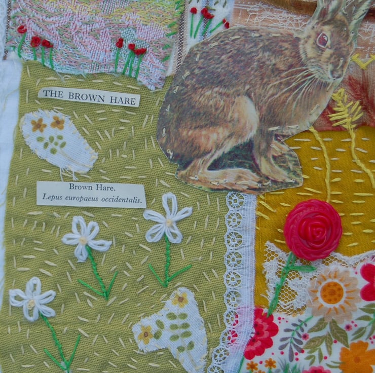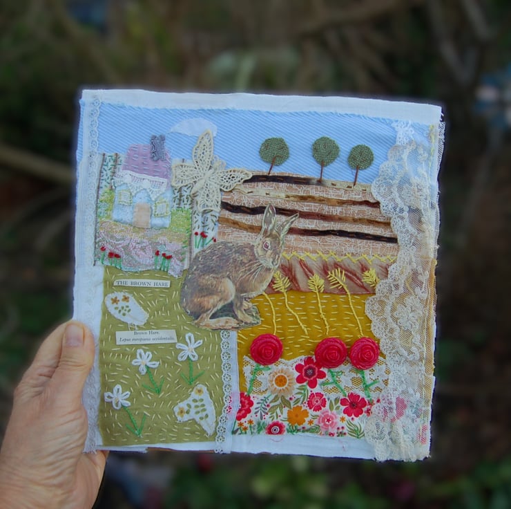 The hare and lettering have been cut from a very worn copy of an Observer book. It is stitched onto the fabric background. All the fabric is either new offcuts or reclaimed from vintage items. A variety of hand embroidery holds it all together. No machine stitching. Lengths of lace and buttons add texture.