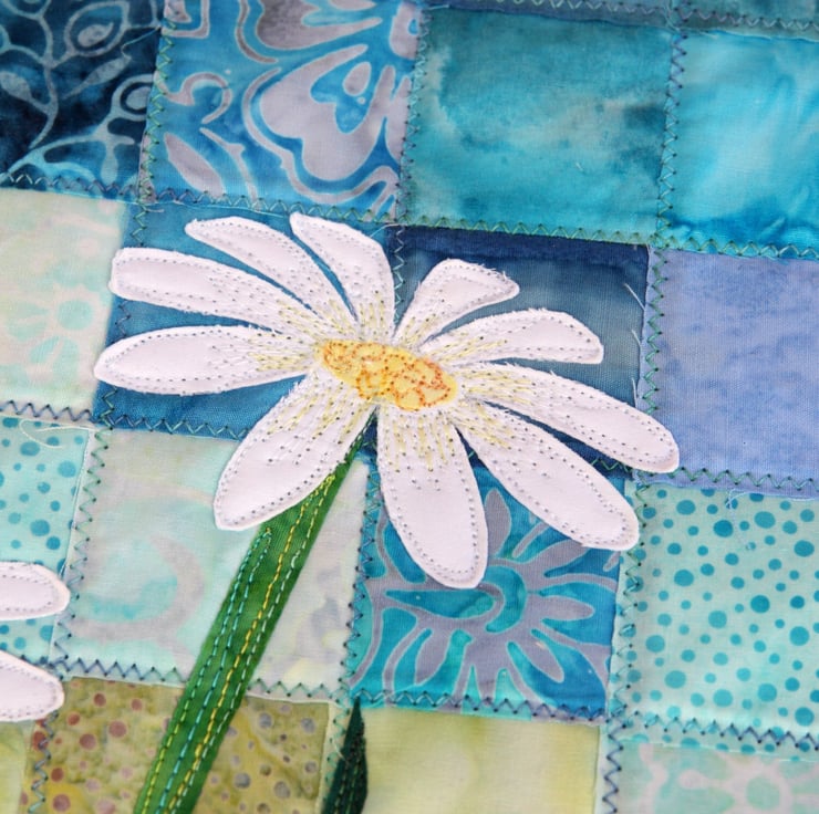 This design uses raw edge applique and fabric collage. I would recommend this to crafters familiar with free motion embroidery.