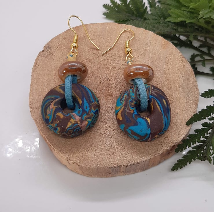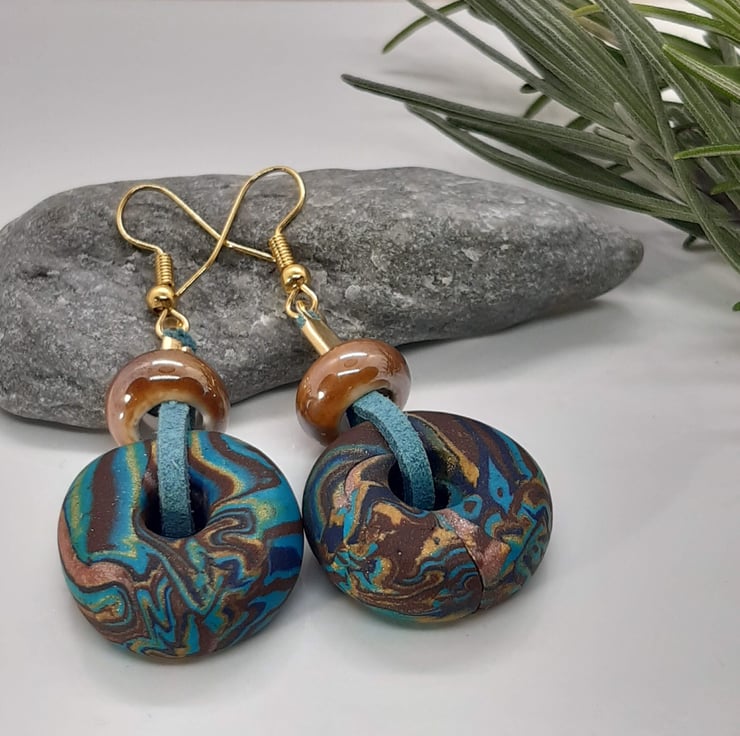 Polymer clay dangly earrings in a chocolate brown, turquoise, gold and black unique swirl design