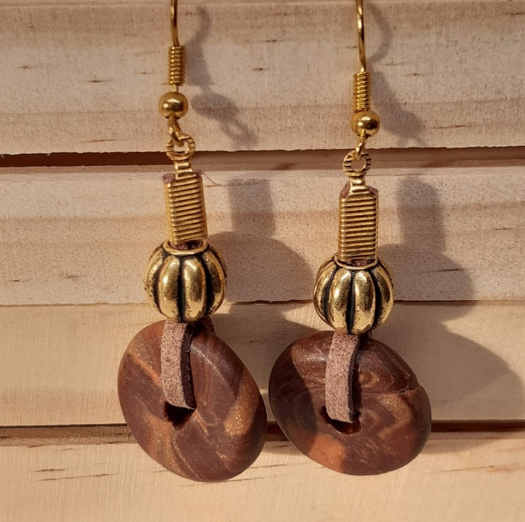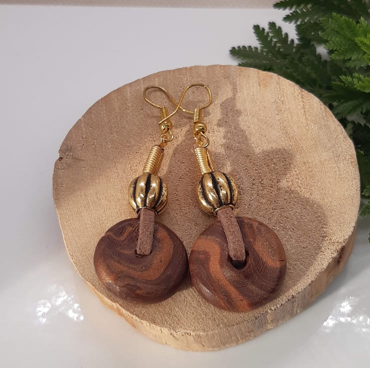 Polymer clay dangly earrings in a brown and gold unique swirl