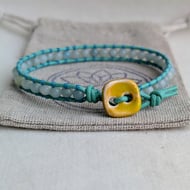 This slender bracelet features dainty semi precious jasper beads in muted earthy tones, attached to forest green leather cord. A silver coloured button in the shape of a monstera leaf has been used as a fastener and completes the natural theme of the bracelet.