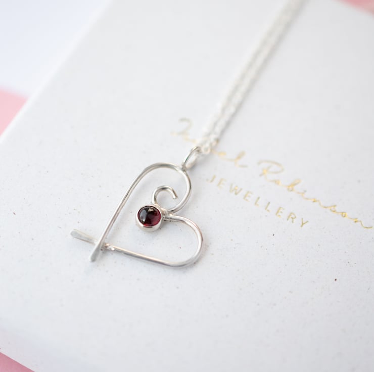 Hand crafted in sterling (925) silver, each heart is hand-shaped in wire before setting a gemstone of rhodolite garnet in the centre. This pinkish form or garnet adds a romantic touch to the design. Once complete, the pendant is hung from a Prince of Wales style chain in your choice of length.