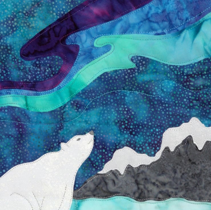 Lovely polar Bear looking to the sky to see the trails of light. The snow fabrics have been sprayed with pearlescent fabric paint to give extra sparkle.