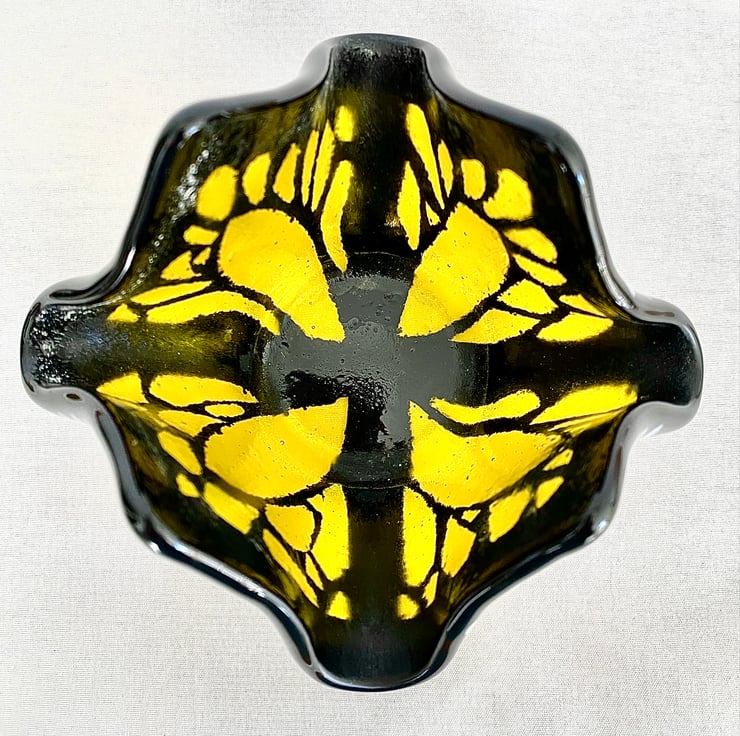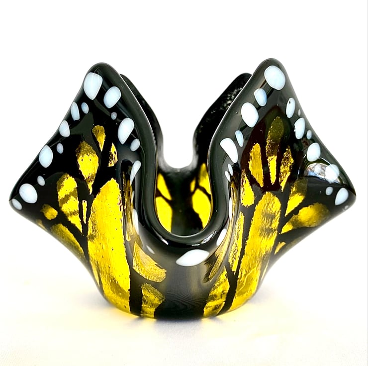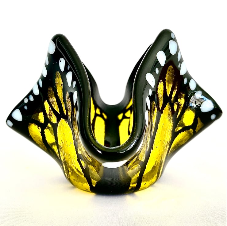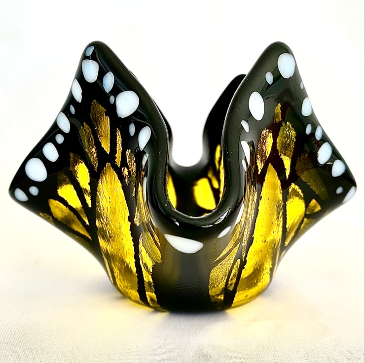 This Butterfly styled vase was first fused as a flat piece to create the pattern. Hand cut yellow coloured art glass, black opal strips and white dots were arranged on a clear 15cm square base. It was fired to 730 degrees Celsius in its first overnight firing. A second overnight firing took place at 790 degrees Celsius to add in the black outlines of the wings to complete the pattern. A third overnight firing at 670 degrees Celsius then took place, draping the flat sheet over a vase mould to allow it to naturally slump over into this handkerchief folded shape.