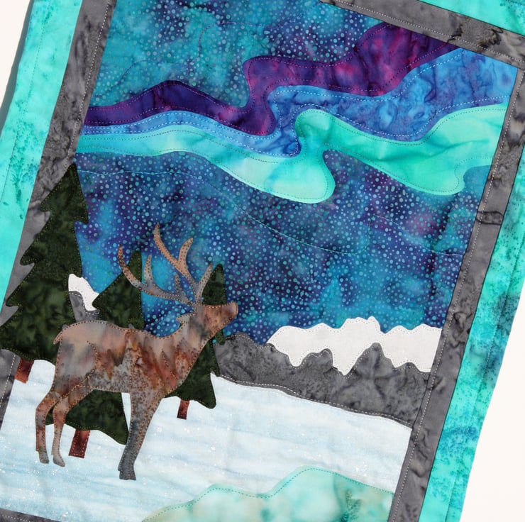 Proud reindeer looking to the sky to see the trails of light. The snow fabrics have been sprayed with pearlescent fabric paint to give extra sparkle.