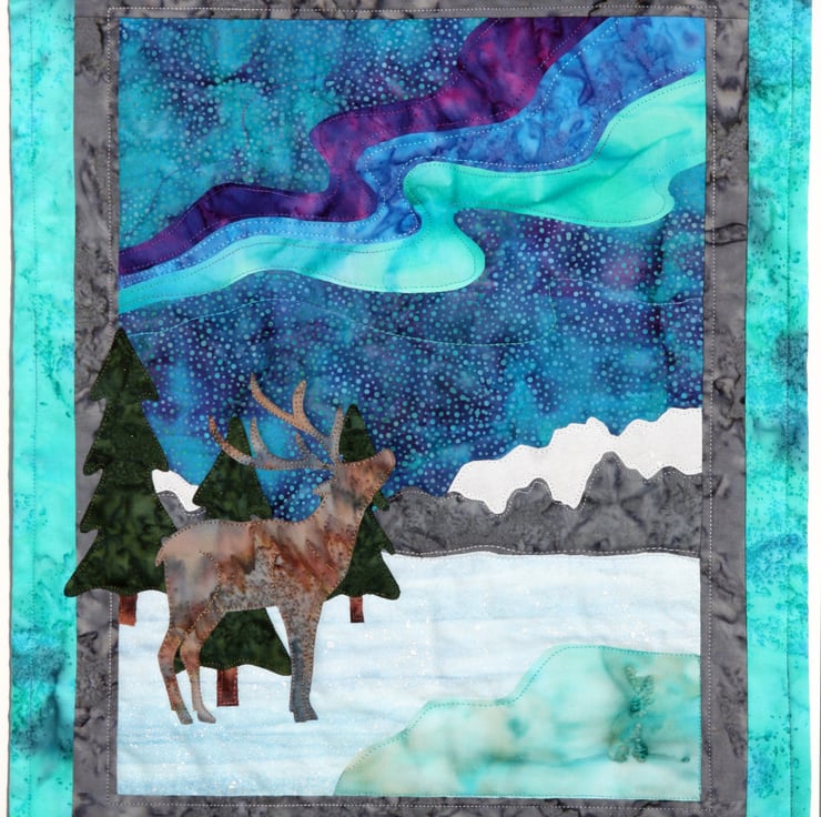 Northern Lights Reindeer Pattern Art Quilt Wall Hanging
