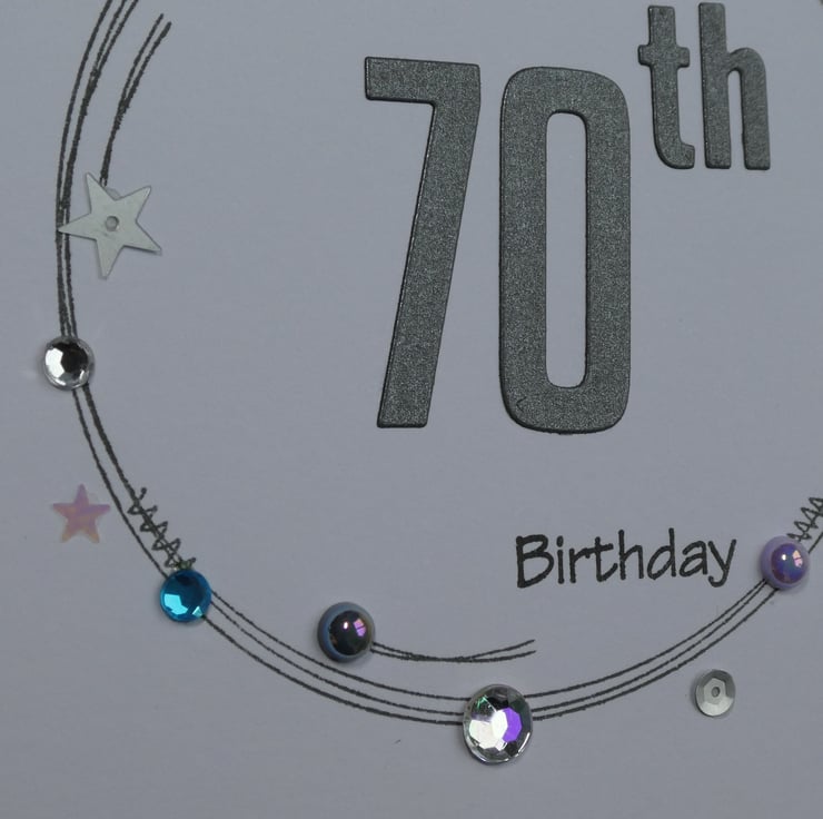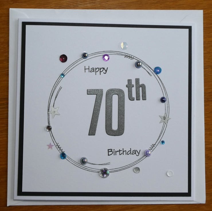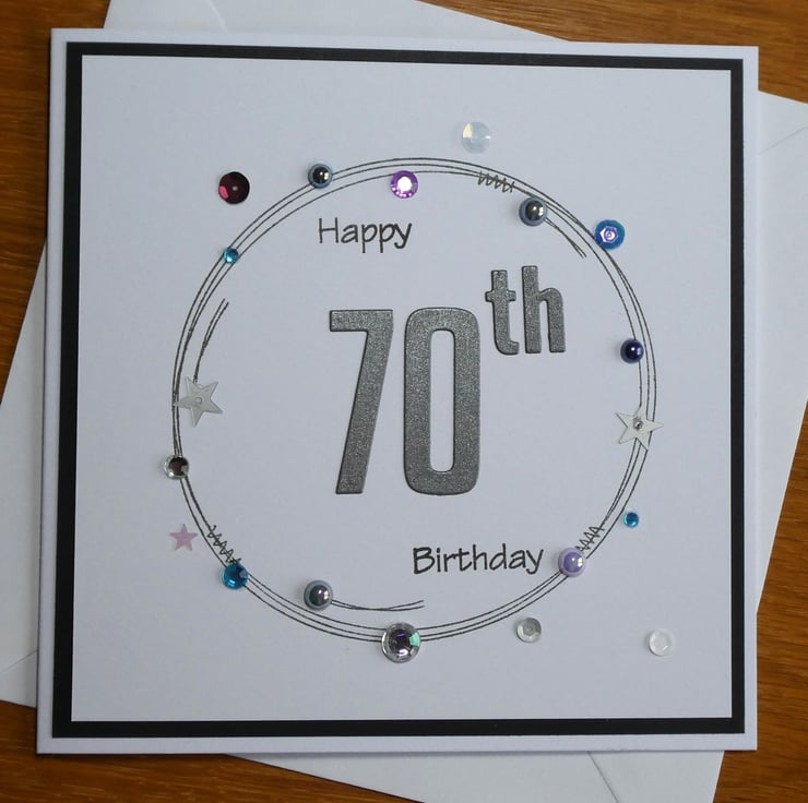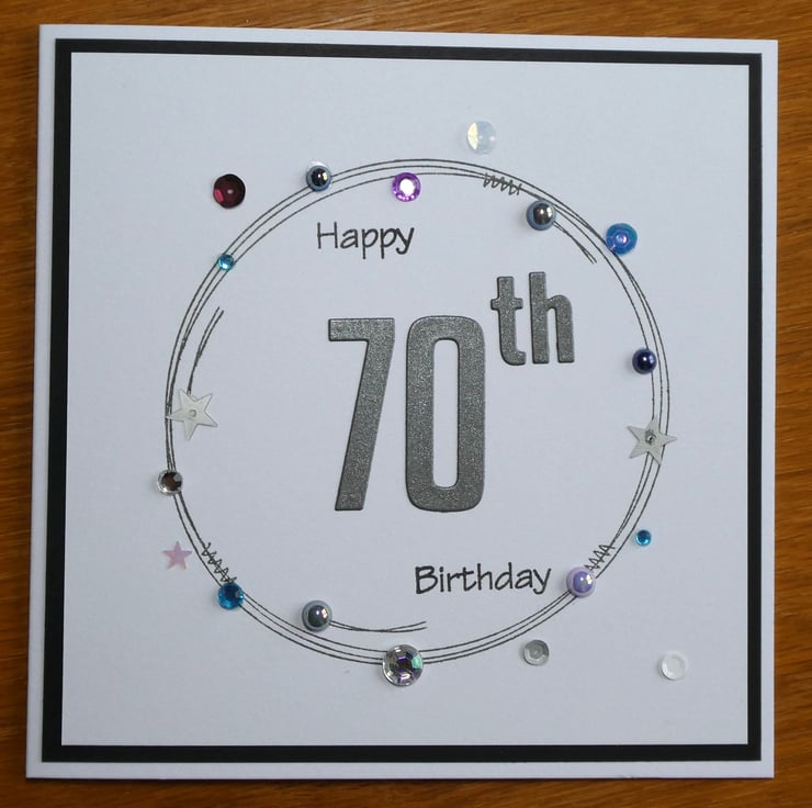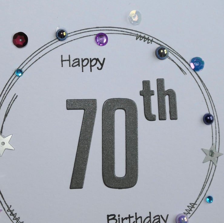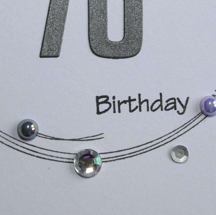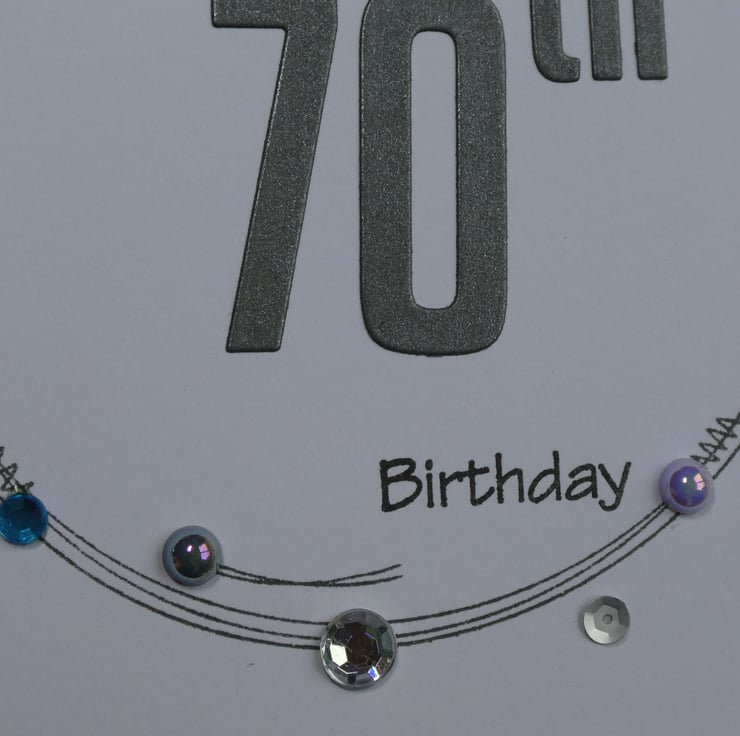 The front of the card has the greeting Happy 70th Birthday in a mix of black archival ink and pearlescent dark grey card.