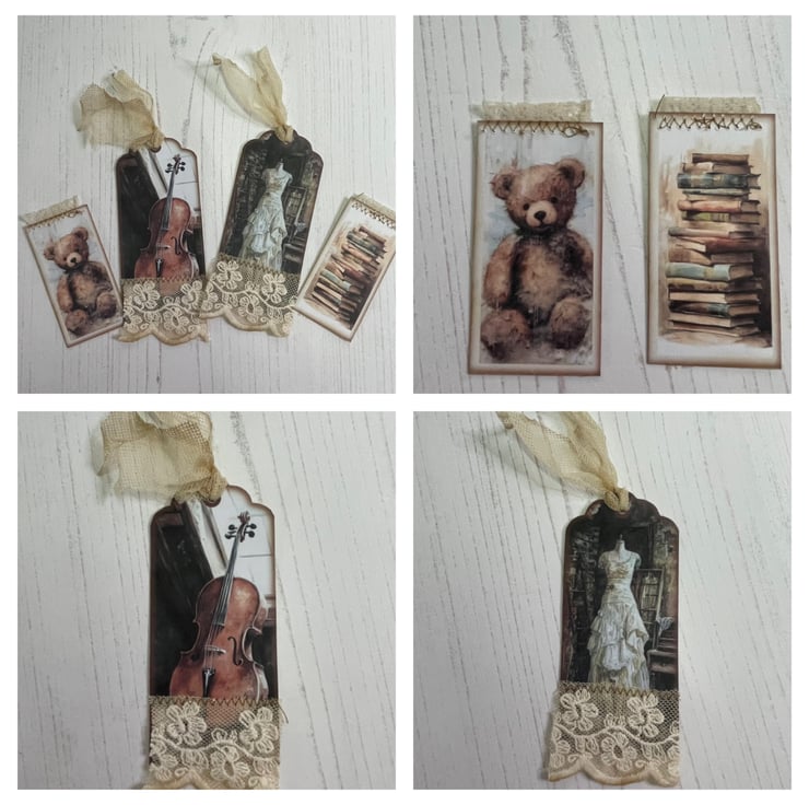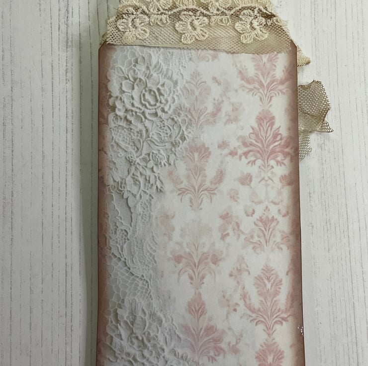 The pocket holds 2 tags 4” x 2.75” with vintage netting as ties and vintage lace across the bottom. 2 mini tags with lace tabs. Measure 2.75” x 1.25”.