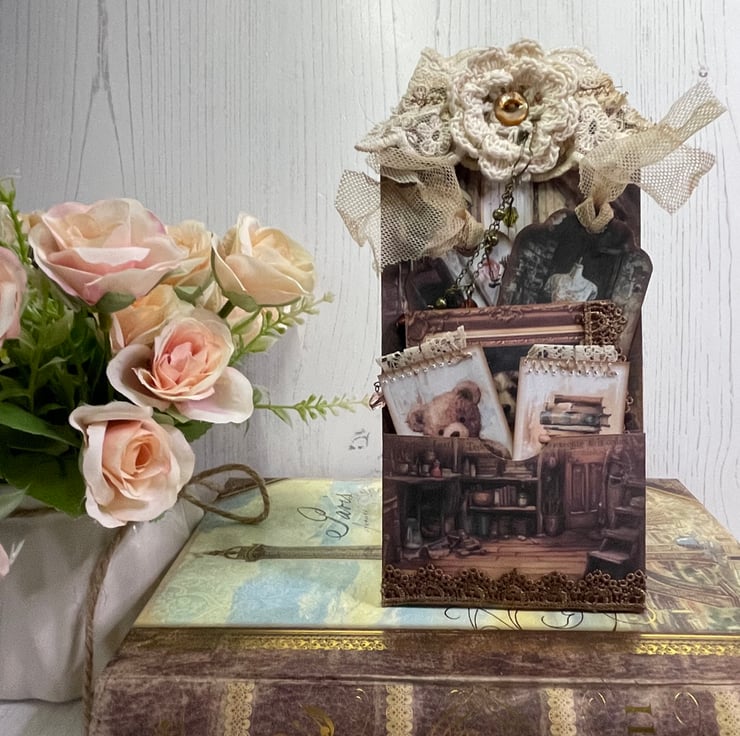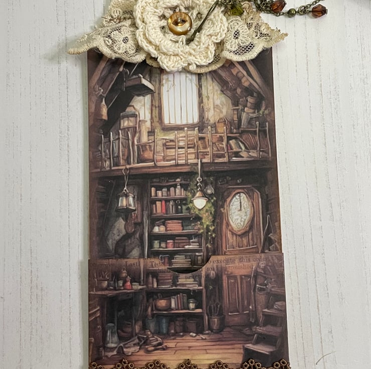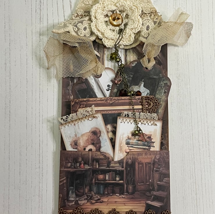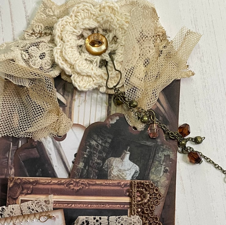 Vintage shabby room, maybe in the attic, holding all sorts of treasures. This delightful pocket tag decorated with vintage lace, crochet doily and button. Chain and crystal dangle attached with a bulb pin.