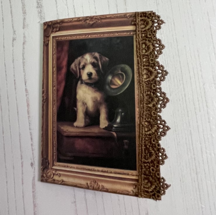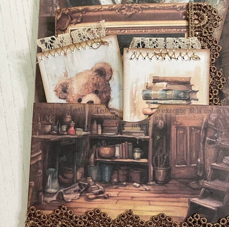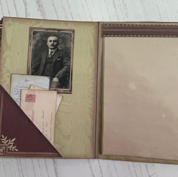 Mini notebook decorated with lace edging. Corner pocket with 3 mini cards. Photo of a gentleman on the inner cover. Coffee stained paper of 10 mini sheets added to the inside back cover. Measures 4.75” x 2.5”.