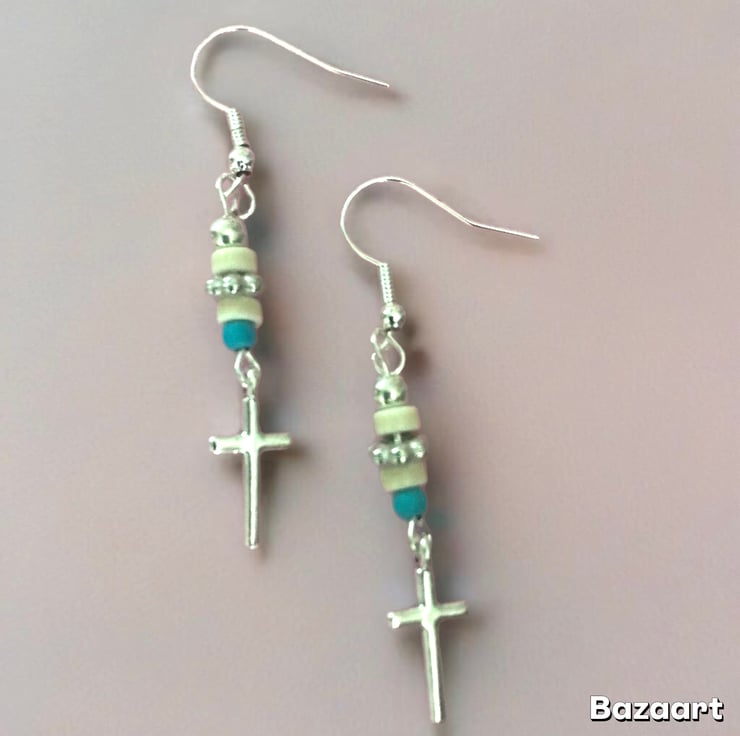 Beautiful boho earrings featuring cross charms. Tarnish resistant silver plate jewellery wire.