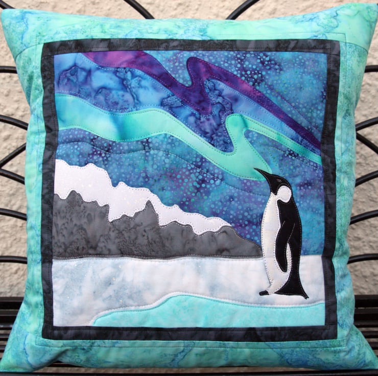 Lovely penguin looking to the sky to see the trails of light. The snow fabrics have been sprayed with pearlescent fabric paint to give extra sparkle.