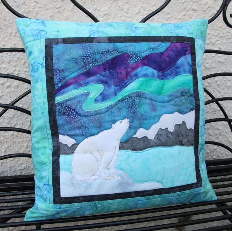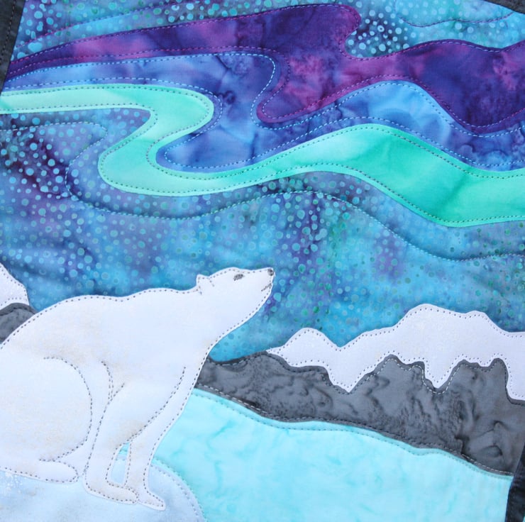 Lovely polar bear looking to the sky to see the trails of light. The snow fabrics have been sprayed with pearlescent fabric paint to give extra sparkle.