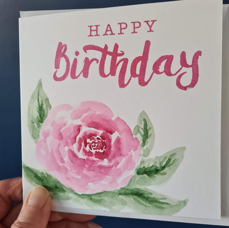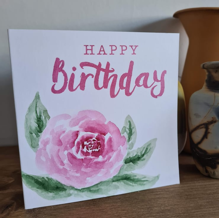 This rose floral birthday card is handpainted (not a print) in watercolour on quality 240gsm card, measuring 5x5 inches. It is blank inside for your own message.
