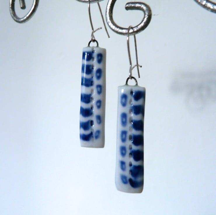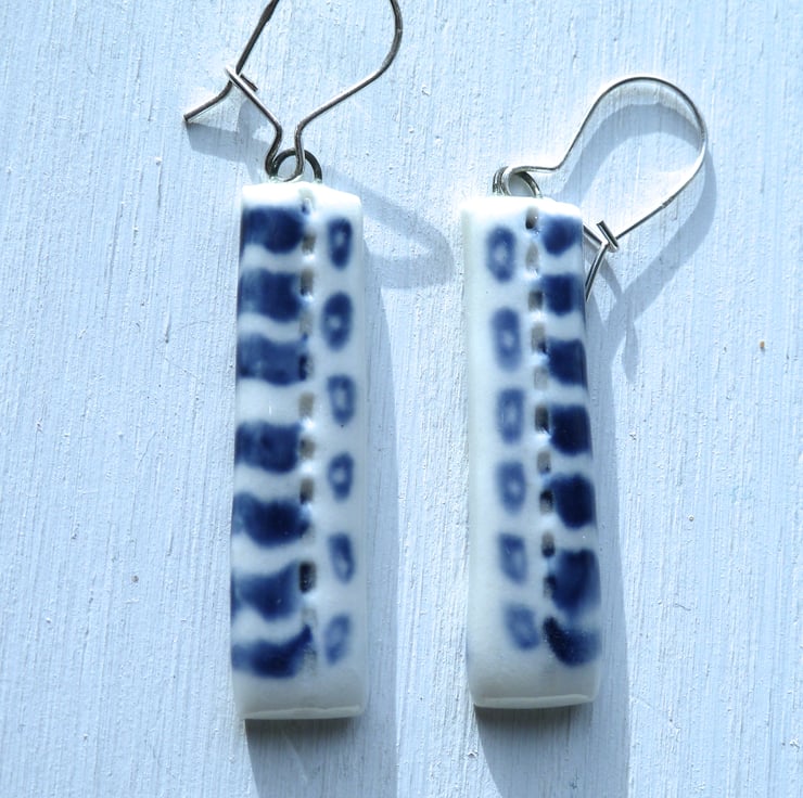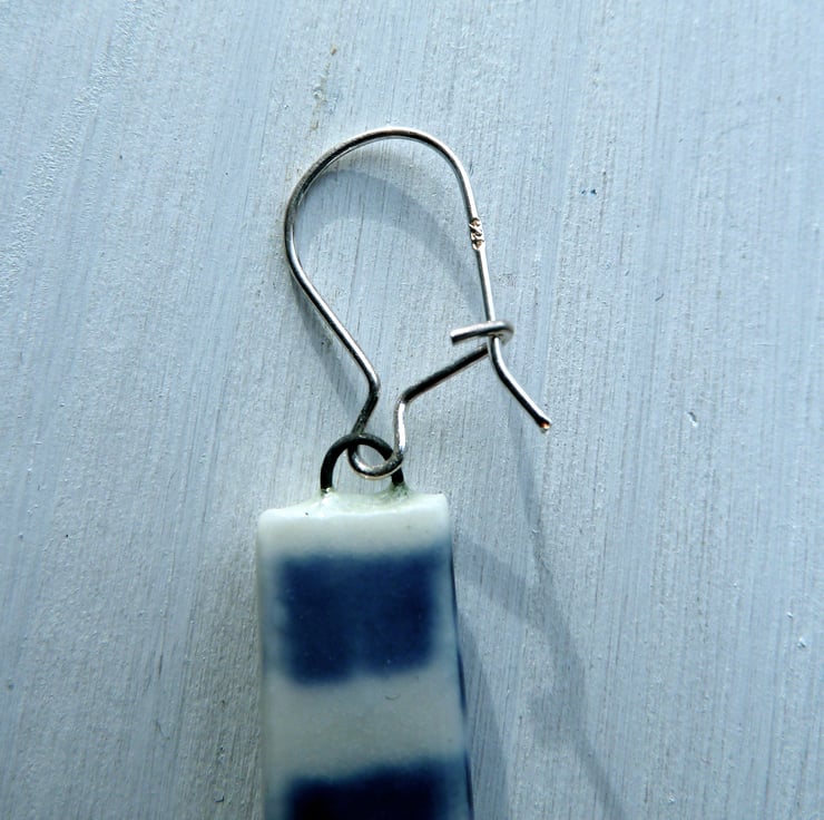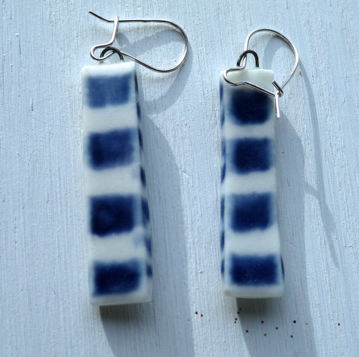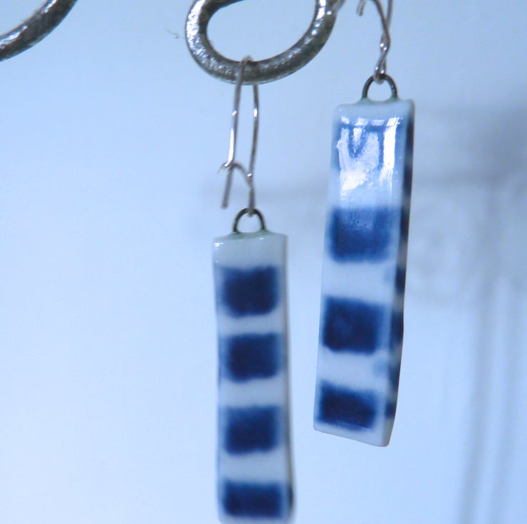 These delicate porcelain drop earrings are hung on sterling silver hooks. Hand made and painted by Linda in her studio in Winchester they are delightfully light to wear. A smooth shiny glaze enhances the blue and white design, front and back. The hooks enable the earrings to be reversed for an alternative striped pattern.