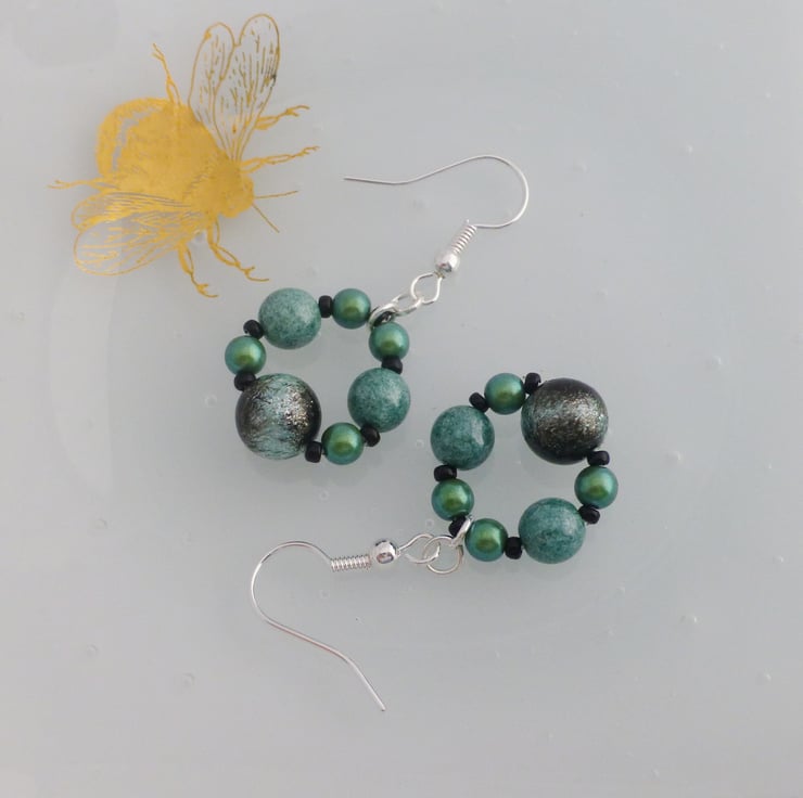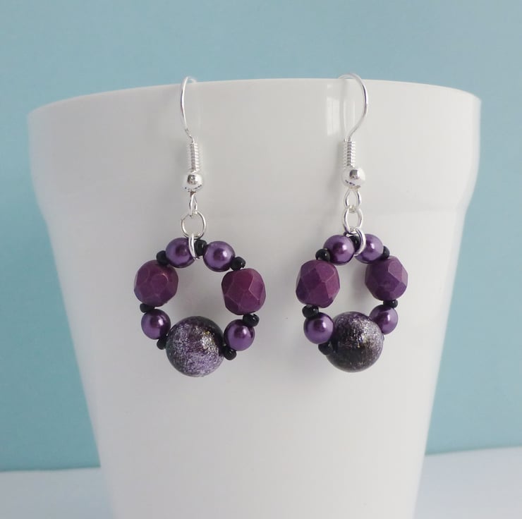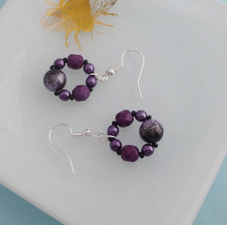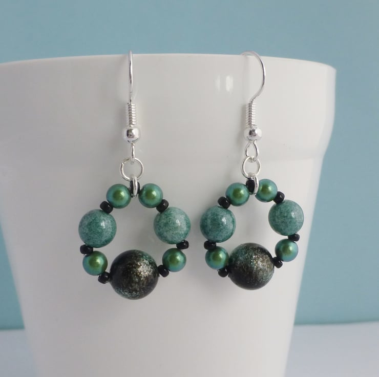 Pretty bead earrings with a circular drop, in your choice of blue, green, purple or red, these cute earrings are approx 2cm long not including the earwires.