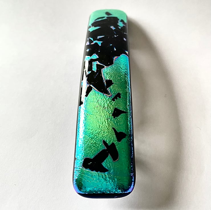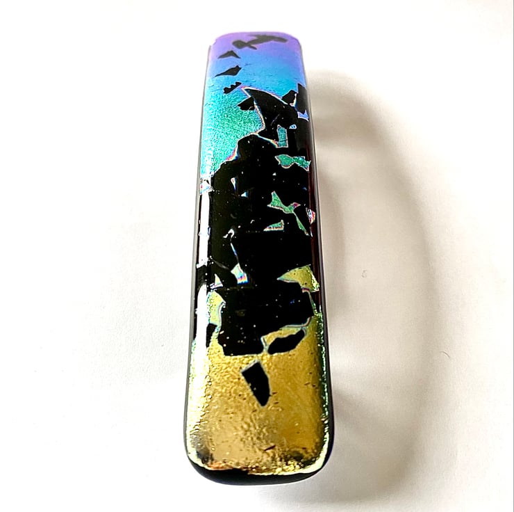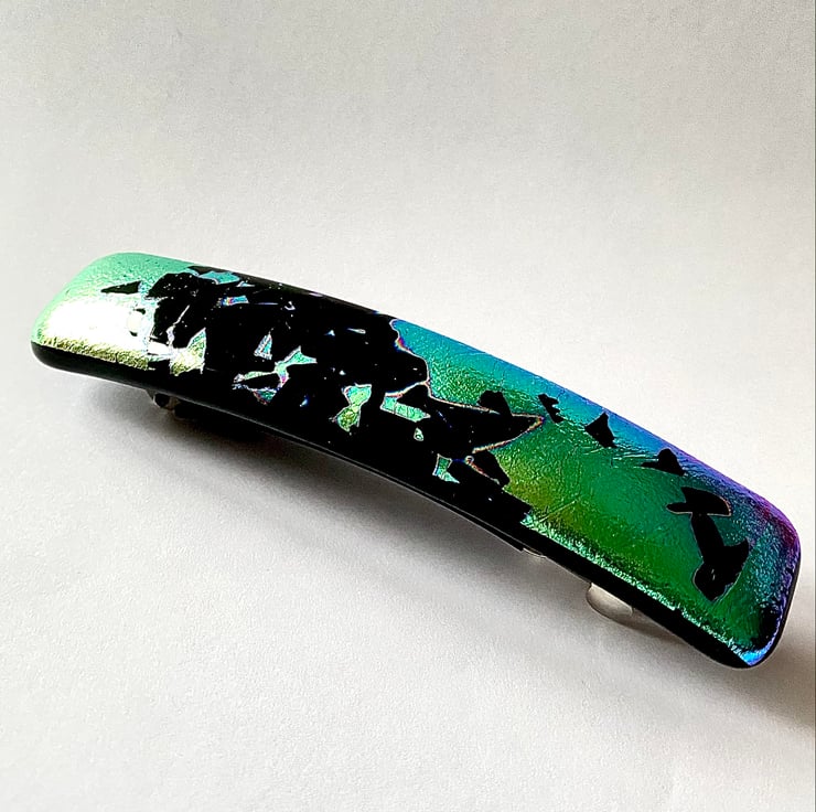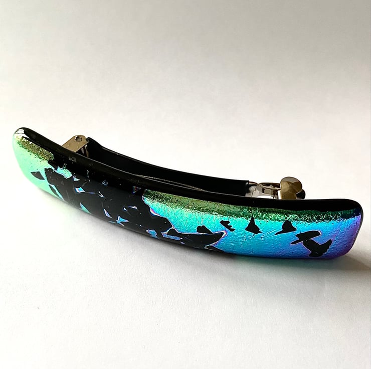 The barrette is individually made by layering dichroic glass and kiln-firing it to create a smooth, glossy surface with a unique, multicoloured splatter effect. The glass is securely mounted onto a strong French-style metal clasp, making it both eye-catching and practical for everyday wear or special occasions.