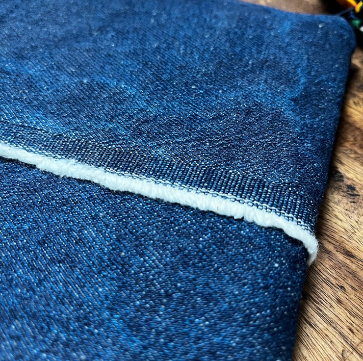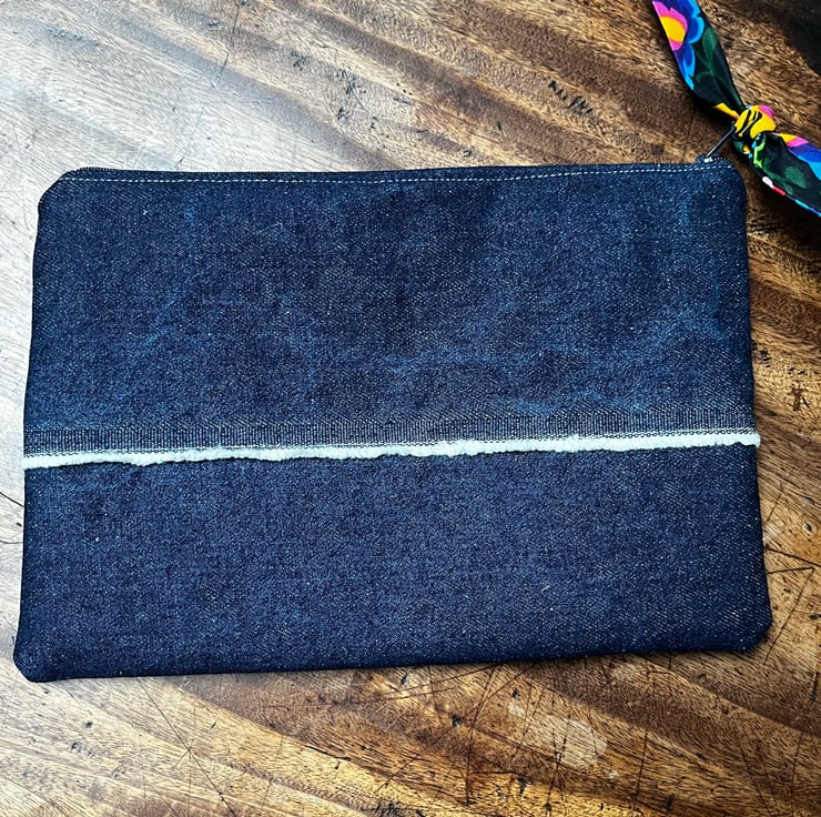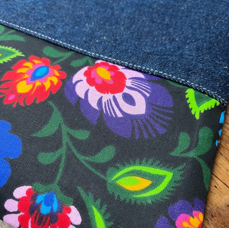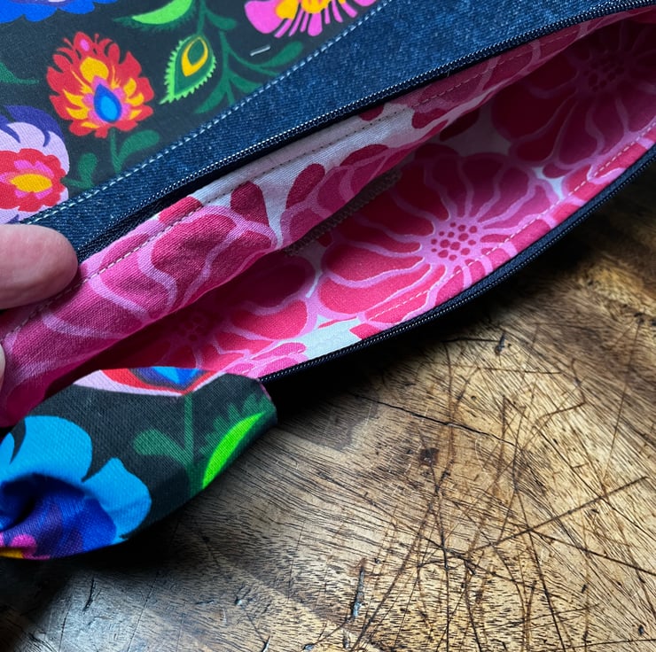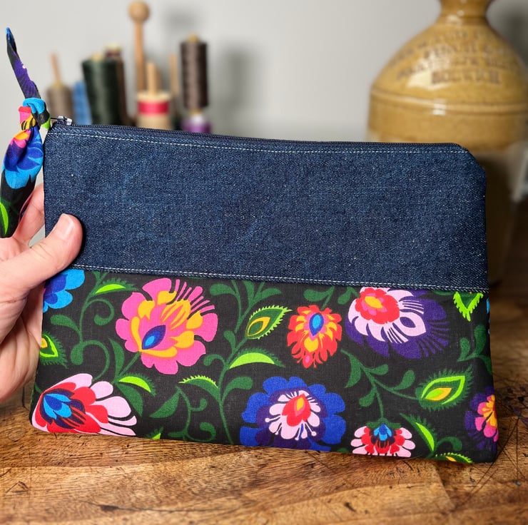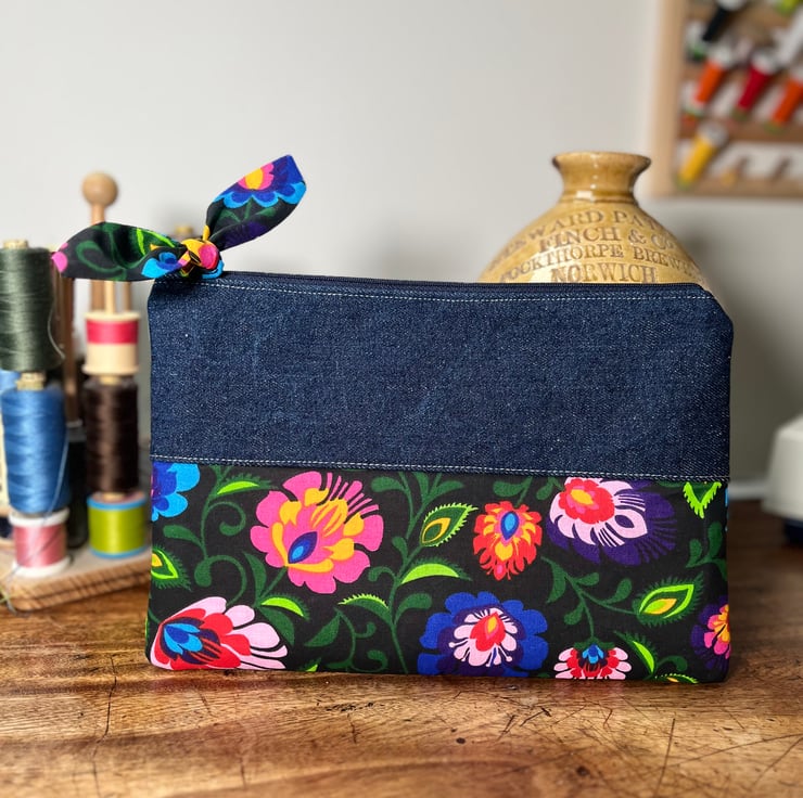 One of a kind zip pouch made from offcuts of dark denim and bright floral cotton. The pouch is fully lined with pink and white floral cottton and a layer of interfacing gives it some body. There is a matching bow on the zip pull.