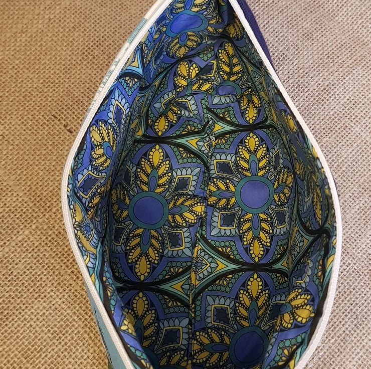 the pouch is lined with a blue and yellow print cotton.