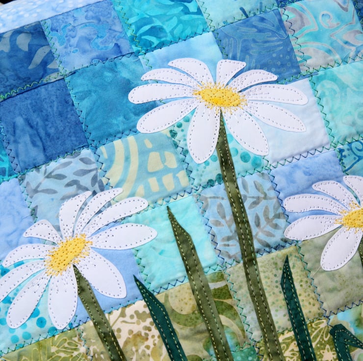 This design uses raw edge applique and fabric collage. I would recommend this to crafters familiar with free motion embroidery.