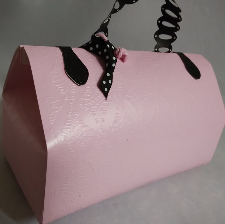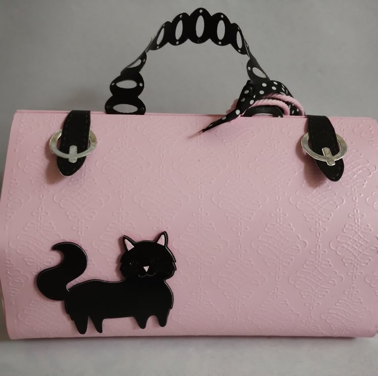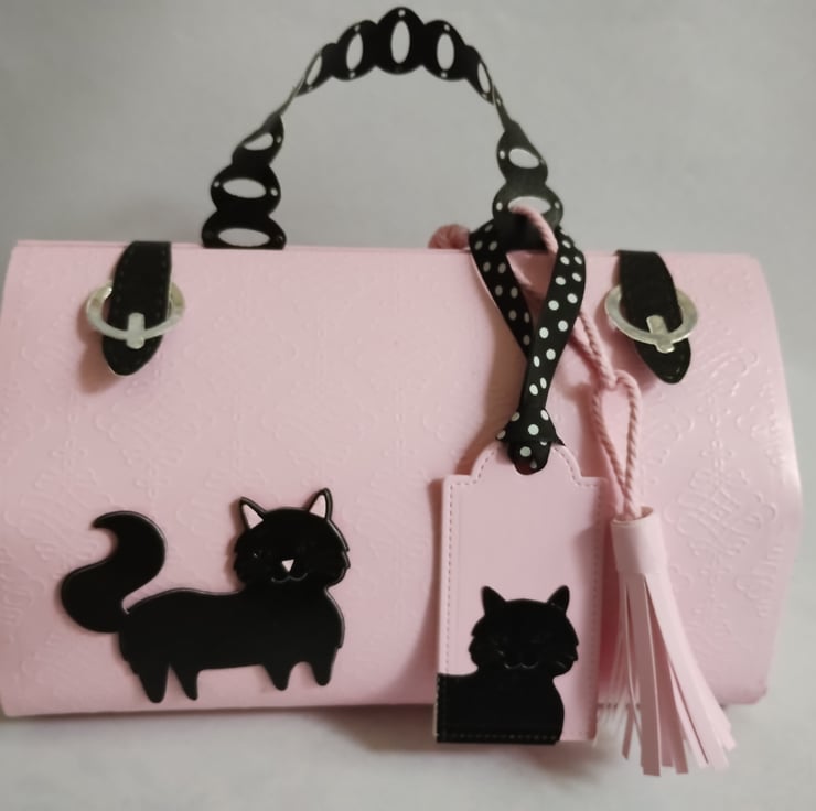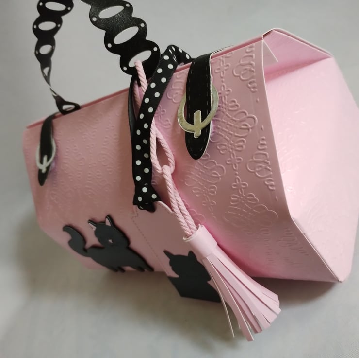 Fabulous PURRfect pink curvy rounded handbag style gift box made from premium quality coated pink cardstock which I have embossed in a lovely curly pattern. It features a cute kitty die cut for black pearl finish cardstock. There is a decorative black loopy handle and faux buckle straps (it fastens with hook and loop 'Velcro' type dots underneath the straps). I've made a pink paper tassel to match tied with thick pink twine and the matching gift tags are tied with fabulous black/white polka dot satin type ribbon.