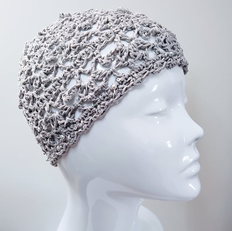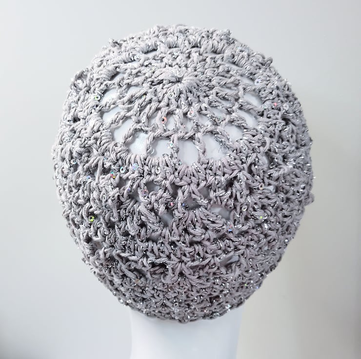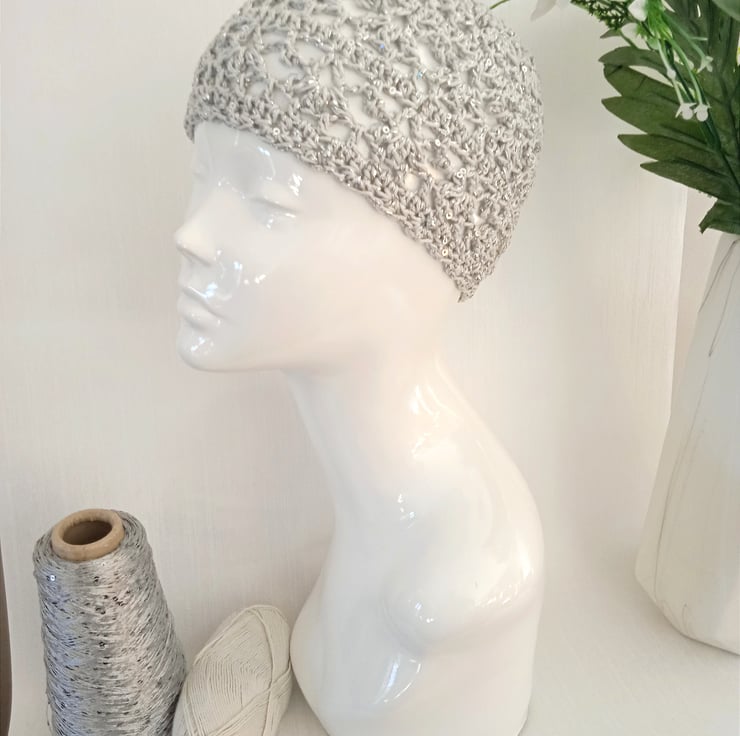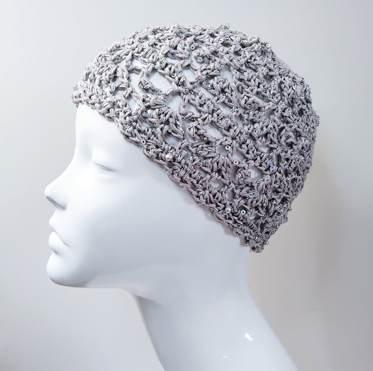 Crochet Silver Glitter Skull Cap with Sequins and Beads