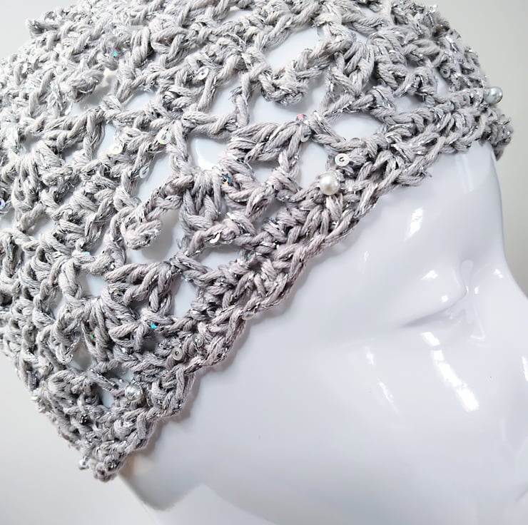 This silver skull cap, hand crafted with mercerised cotton, is finished with a matching glitter thread with silver sequins running throughout the design. Silver coloured glass pearl beads finish the look around the bottom edge of the hat.
