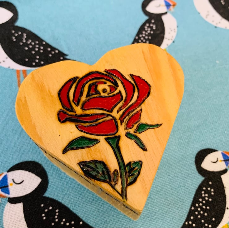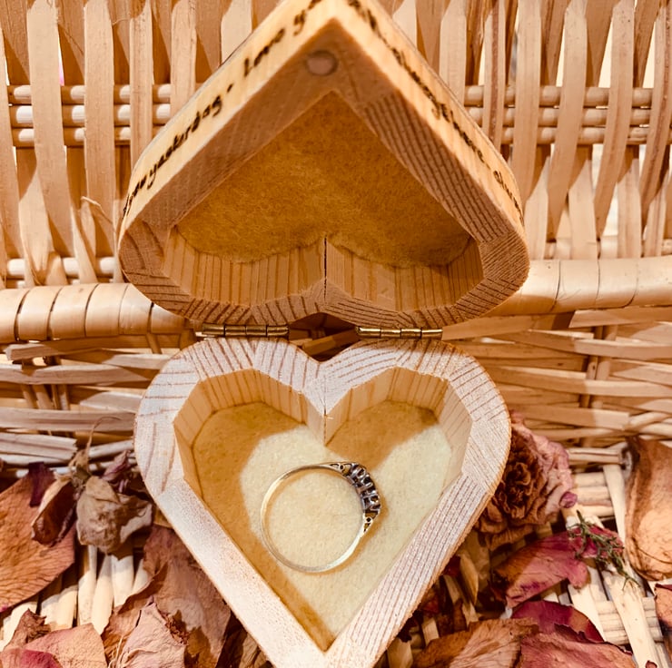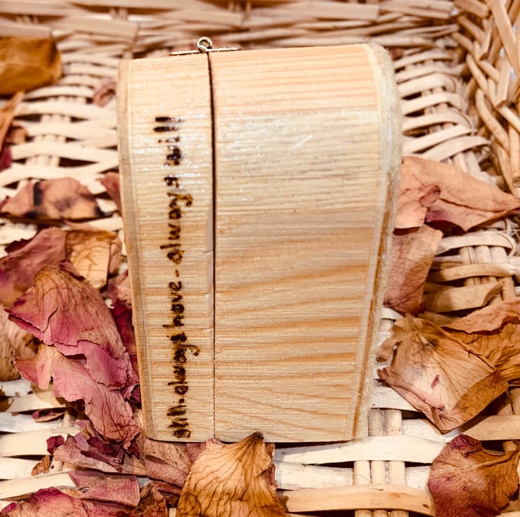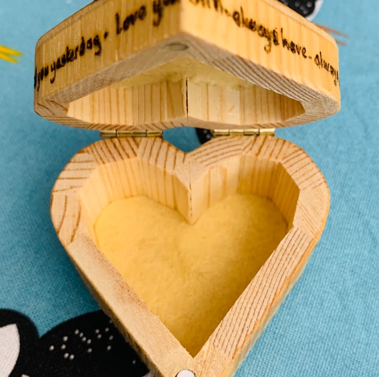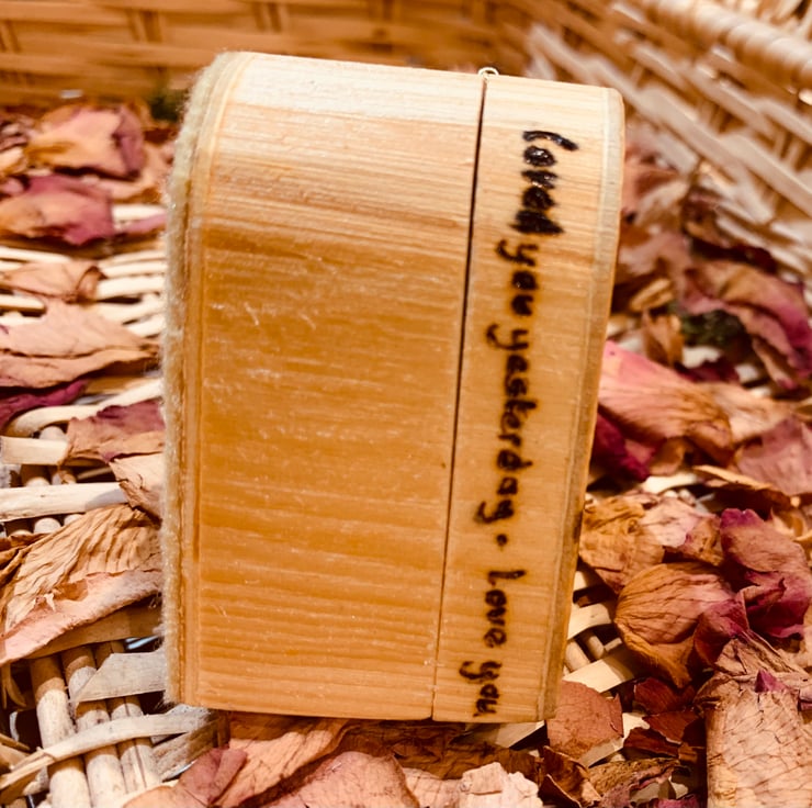 A special little wooden ring trinket box, beautifully pyrographed then painted with a rose. The words ‘loved you yesterday -love you still - always have - always will’ are burned around the edge of the lid, so perfect for Valentine’s Day, or even that important proposal! Lined with felt in the lid and the base plus felt on the bottom.