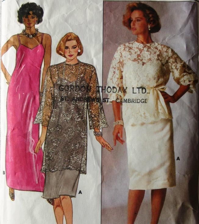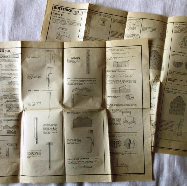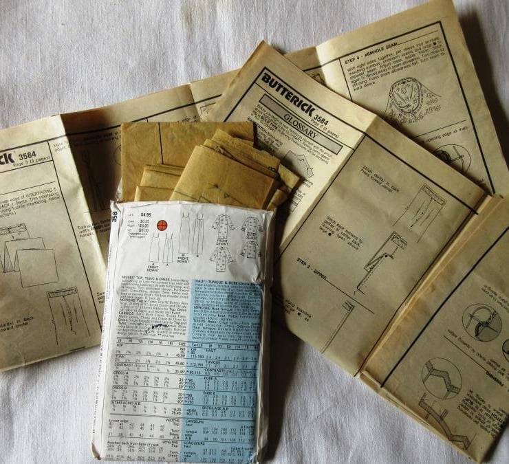 A multi-size sewing pattern for a misses' top, tunic and dress in sizes 14 - 16 - 18 (bust 36"/92 cm - 38"/97 cm - 40"/102 cm, Butterick 3584). The loose-fitting pullover top or tunic has contrast bias neck and back binding, back neck slit with button and loop fastening and three-quarter sleeves. The top has elasticated sleeves and purchased sash. The close-fitting straight dress is below mid-knee or evening length and has bias shoulder straps and back zipper. View B has back slit. The pattern has been used to make size 18, so all the sizes are still useable. The pattern is dated 1985.