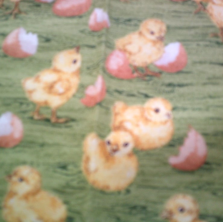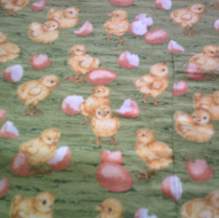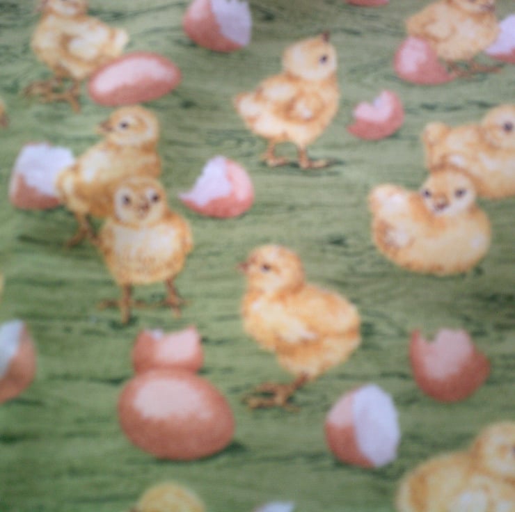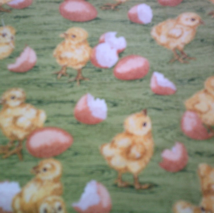 The design of the fabric used for this apron is of Chicks and Eggs on a green background.
