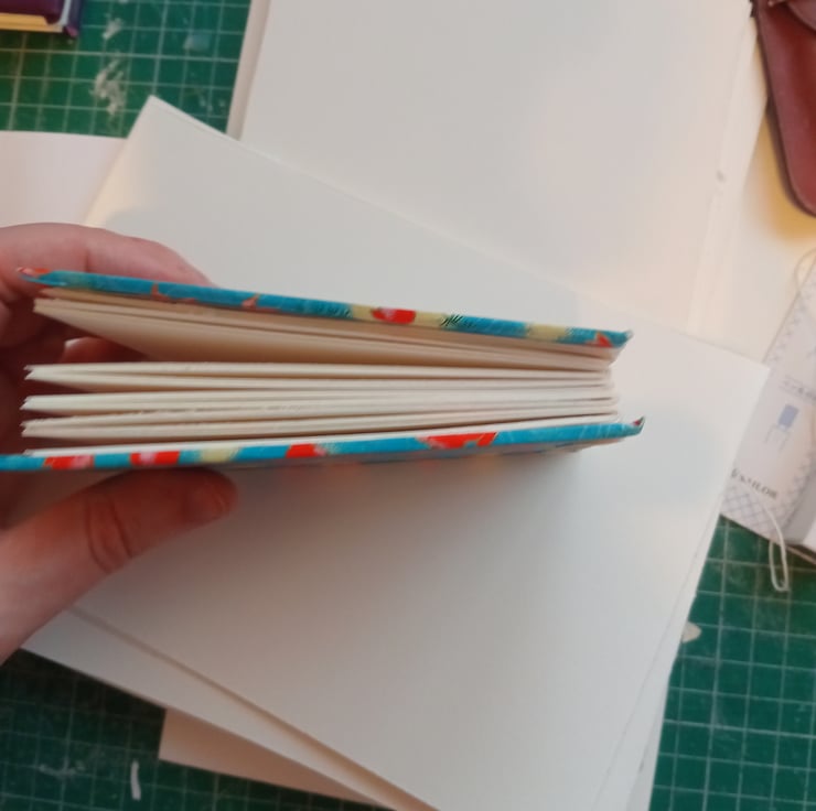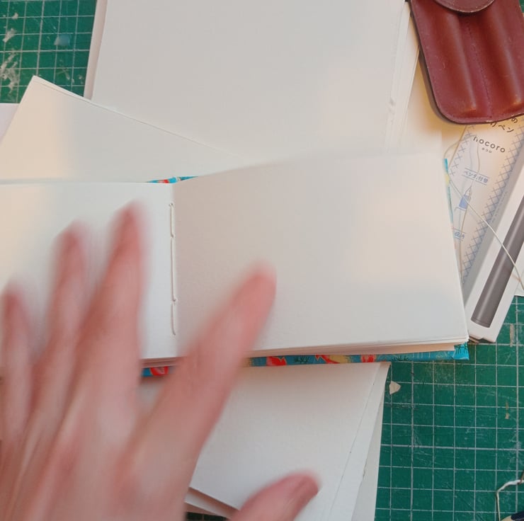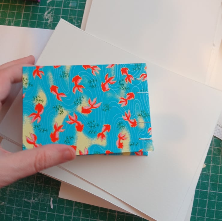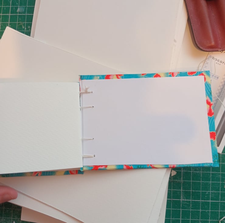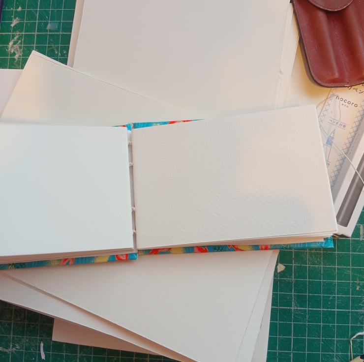 Made with watercolour paper, greyboard, linen thread and japanese decorative paper stitched in coptic stitch binding