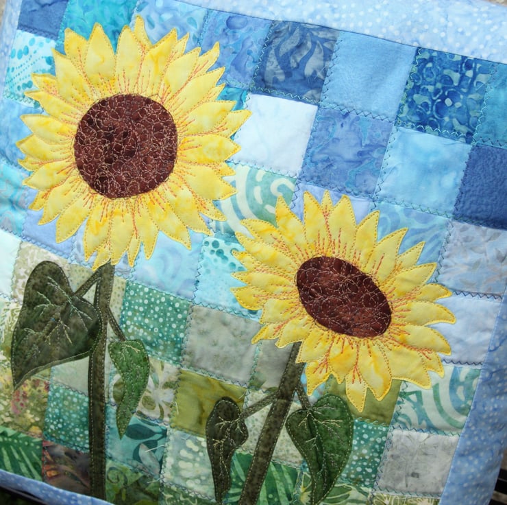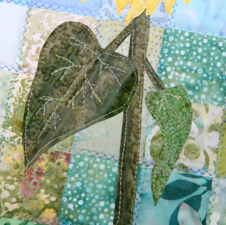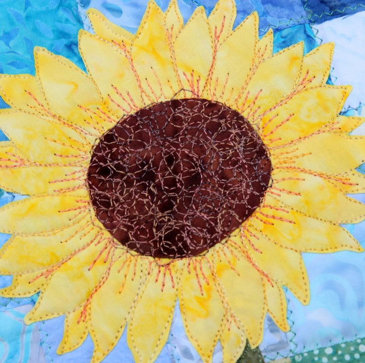 This design uses raw edge applique and fabric collage. I would recommend this to crafters familiar with free motion embroidery.