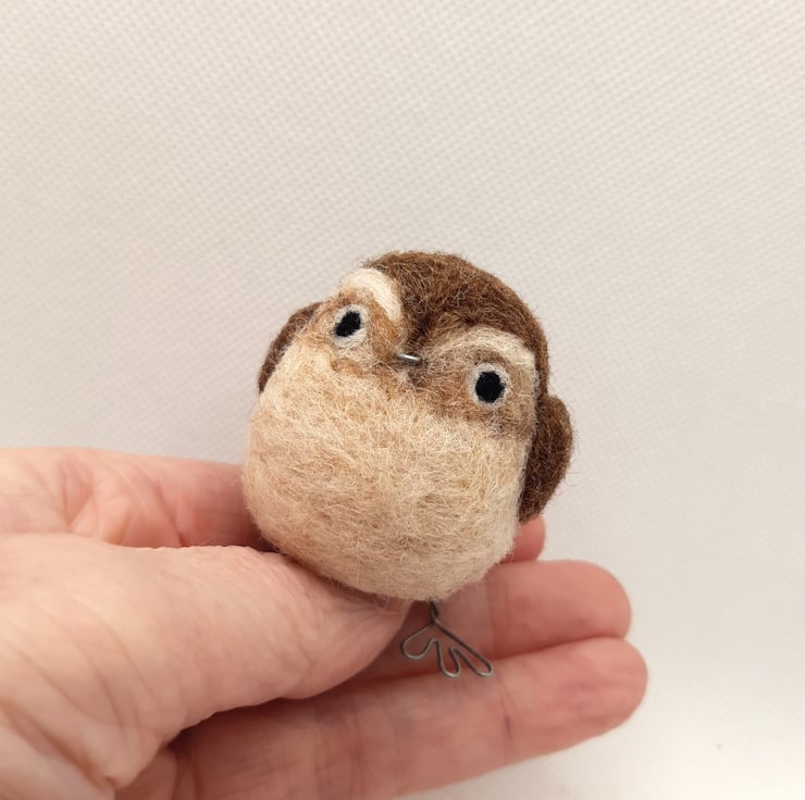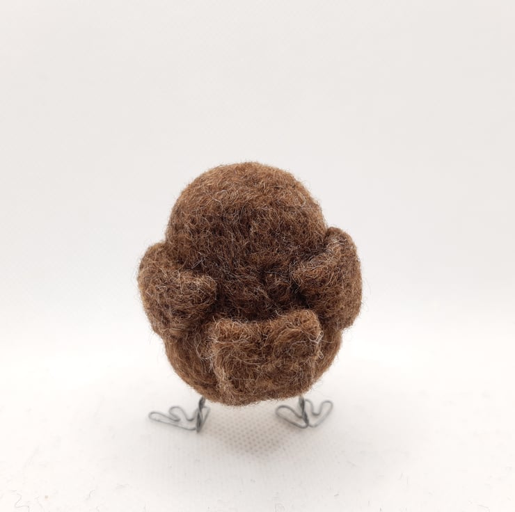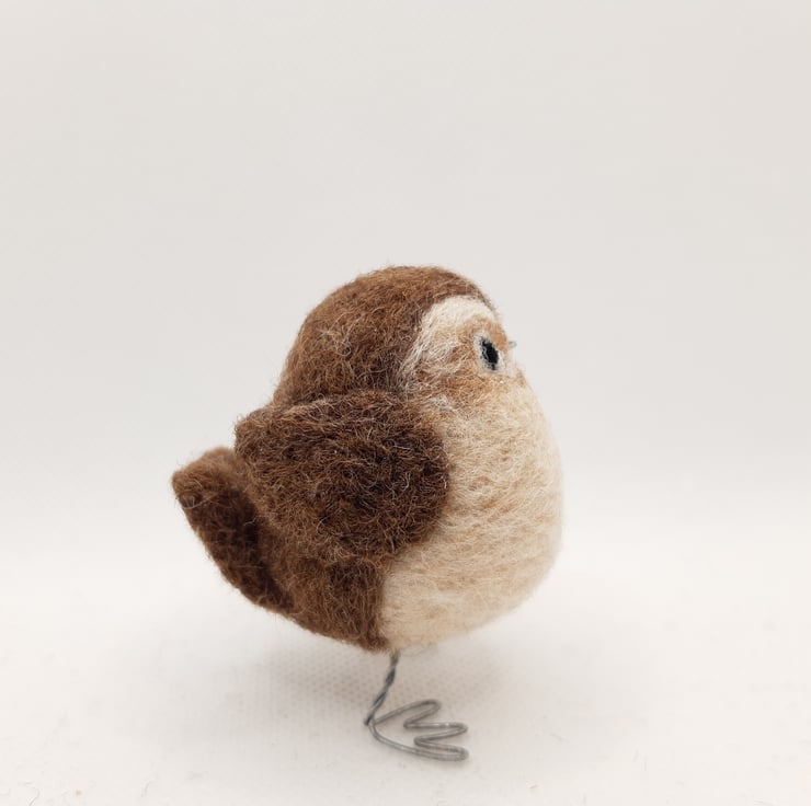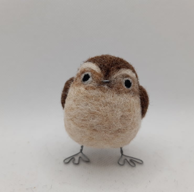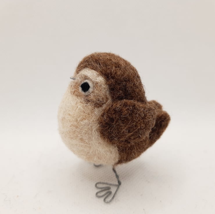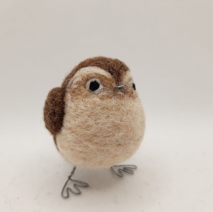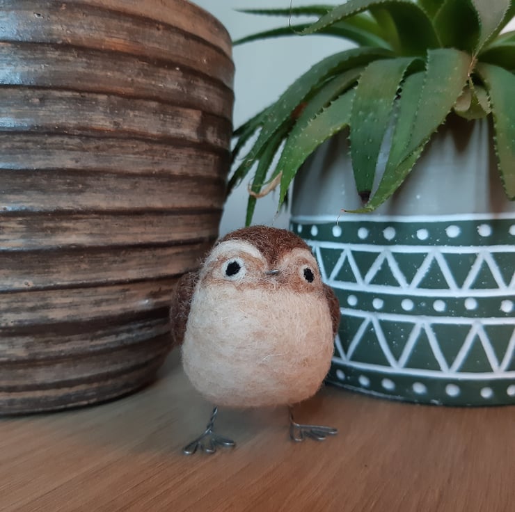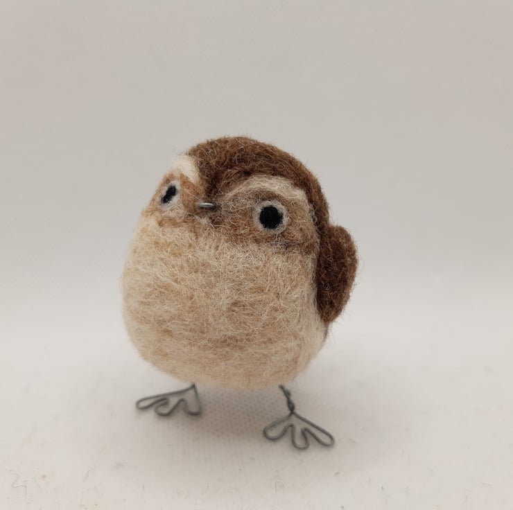 Needle felted wren of the feisty variety measuring approximately 6cm tall with wire beak and feet. As these birds are hand made, colours, features and size vary slightly giving each its own individual character.