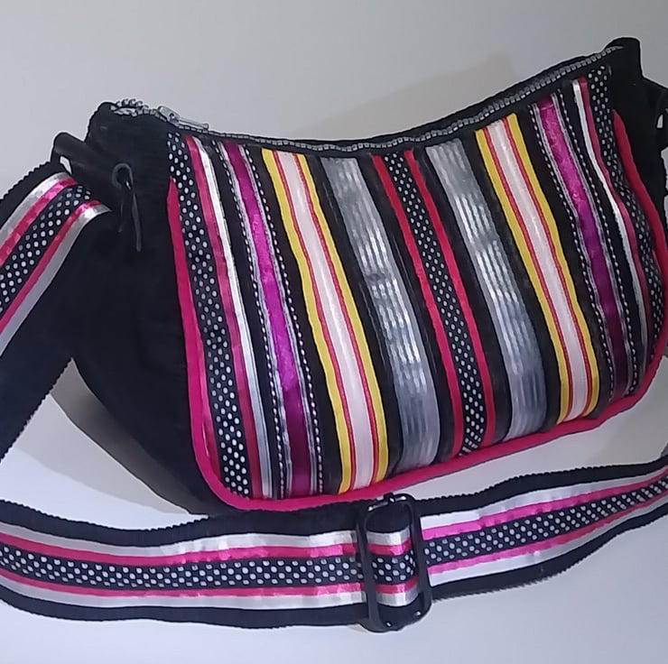 The Back is deep piled velvet but this has been overlaid with bright satin ribbons of varied colours to fit with the front panel.